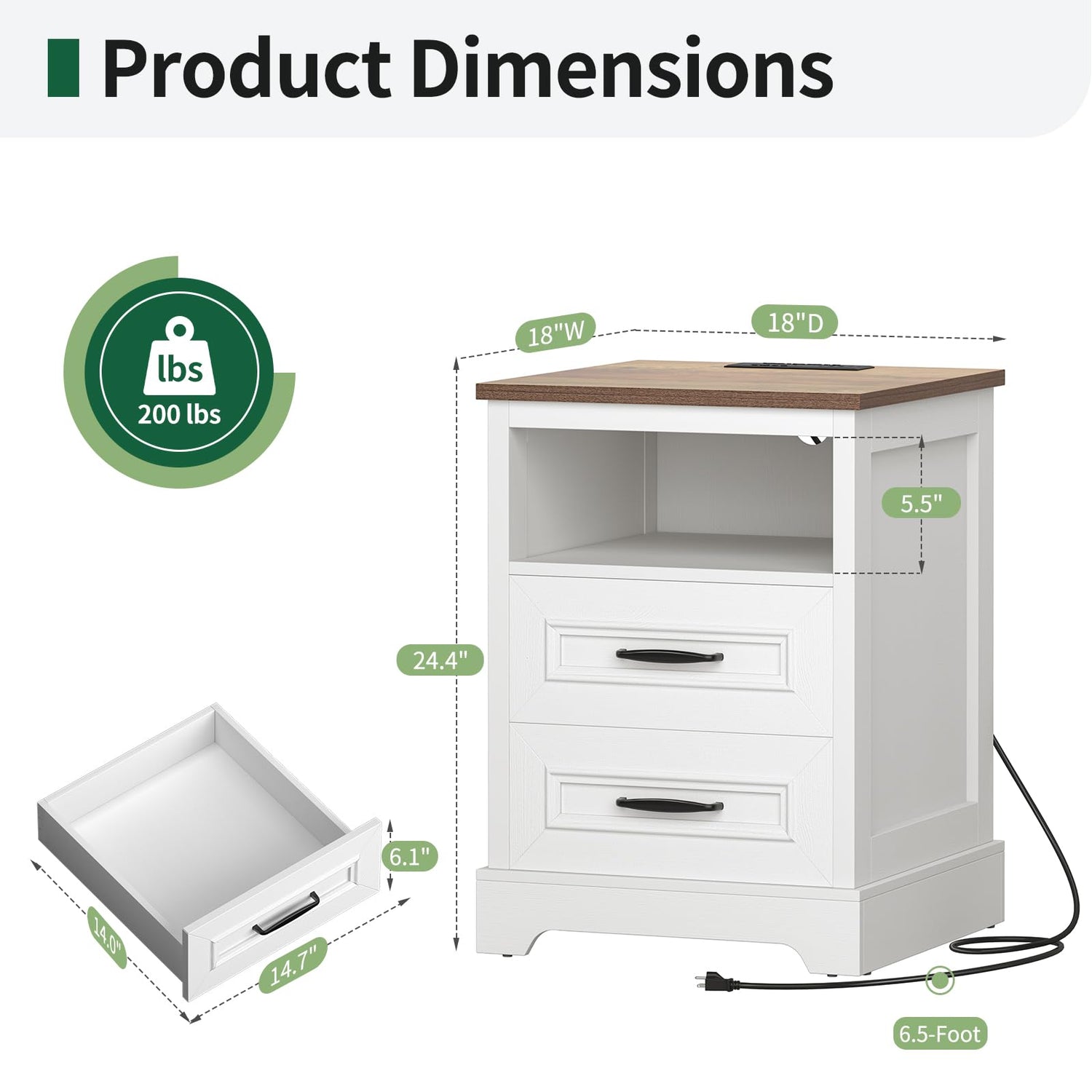 - 【Sturdy & Crafted】Built with thick wood, the night stand with drawers offers a sturdy and durable structure that confidently supports up to 200 lbs to ensure lasting reliability. Not only that, the end table with charging station uses a fine grinding process to produce a smooth surface and delicate touch. Plus, maintaining is effortless - just wipe with a damp cloth.