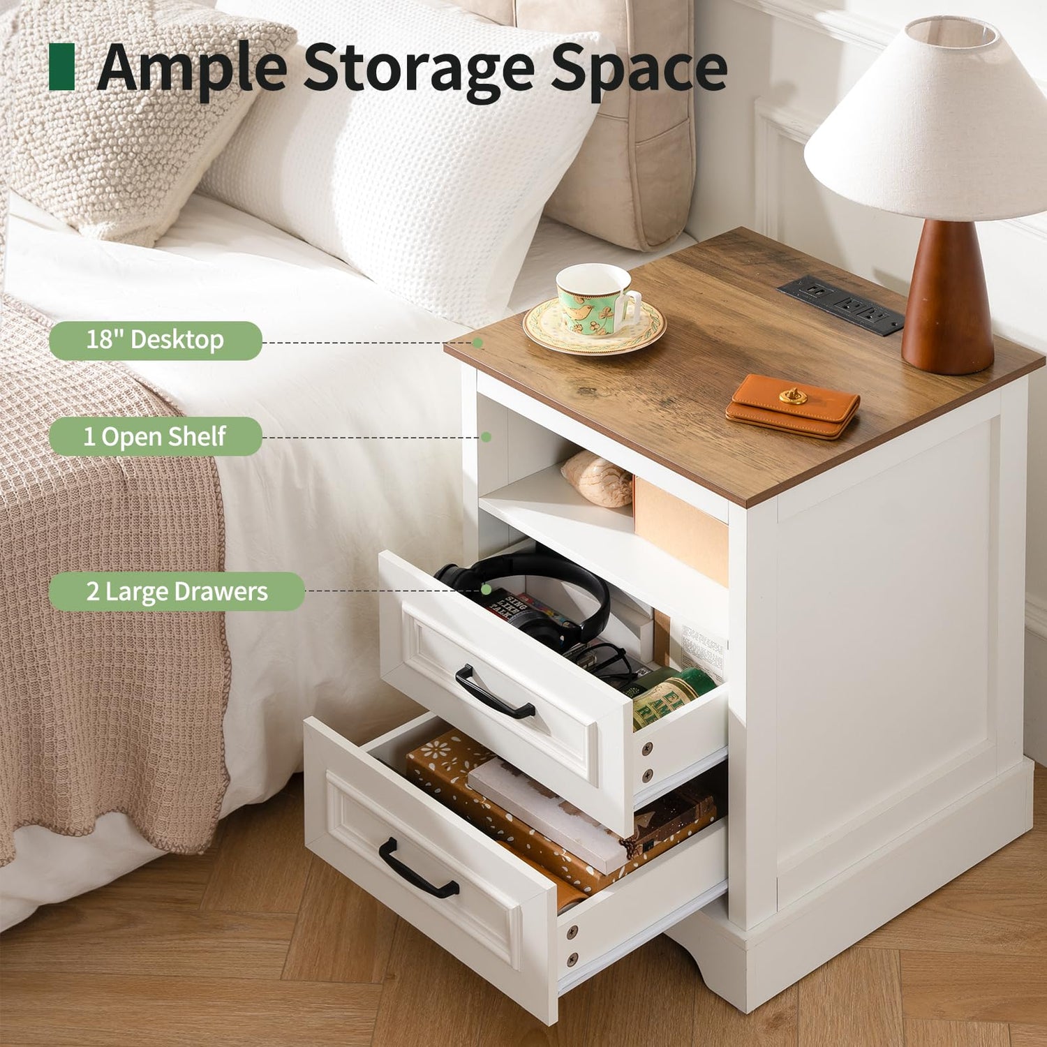 - 【Max Storage, Minimum Fuss】Designed for your daily and decor needs, the end tables living room boast a spacious top and open shelf, perfect for cups, plants, etc. With 2 wooden drawers(14.7"L x 14.0" W x 6.1"H), organization becomes a breeze. You'll have a place for what you need from life to the office. The white nightstand is the combination of storage and display.