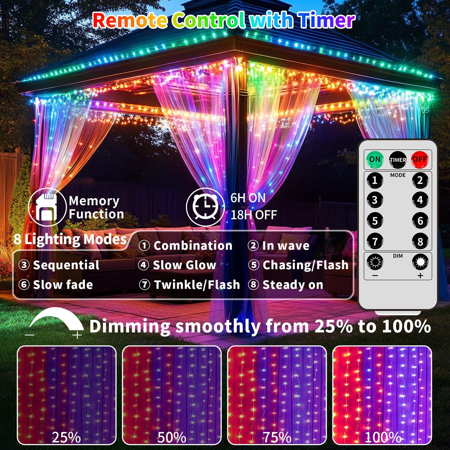- 【2 Types of control & timing battery waterfall lights】Battery powered curtain lights can be controlled by a battery box and remote control (within 10 meters). 8 Lighting modes to choose, 4 brightness adjustment levels, each mode can bring a different atmosphere and mood. ⏲️"Timer", set up fairy lights for 6 hours, 18 hours off, with a timer.