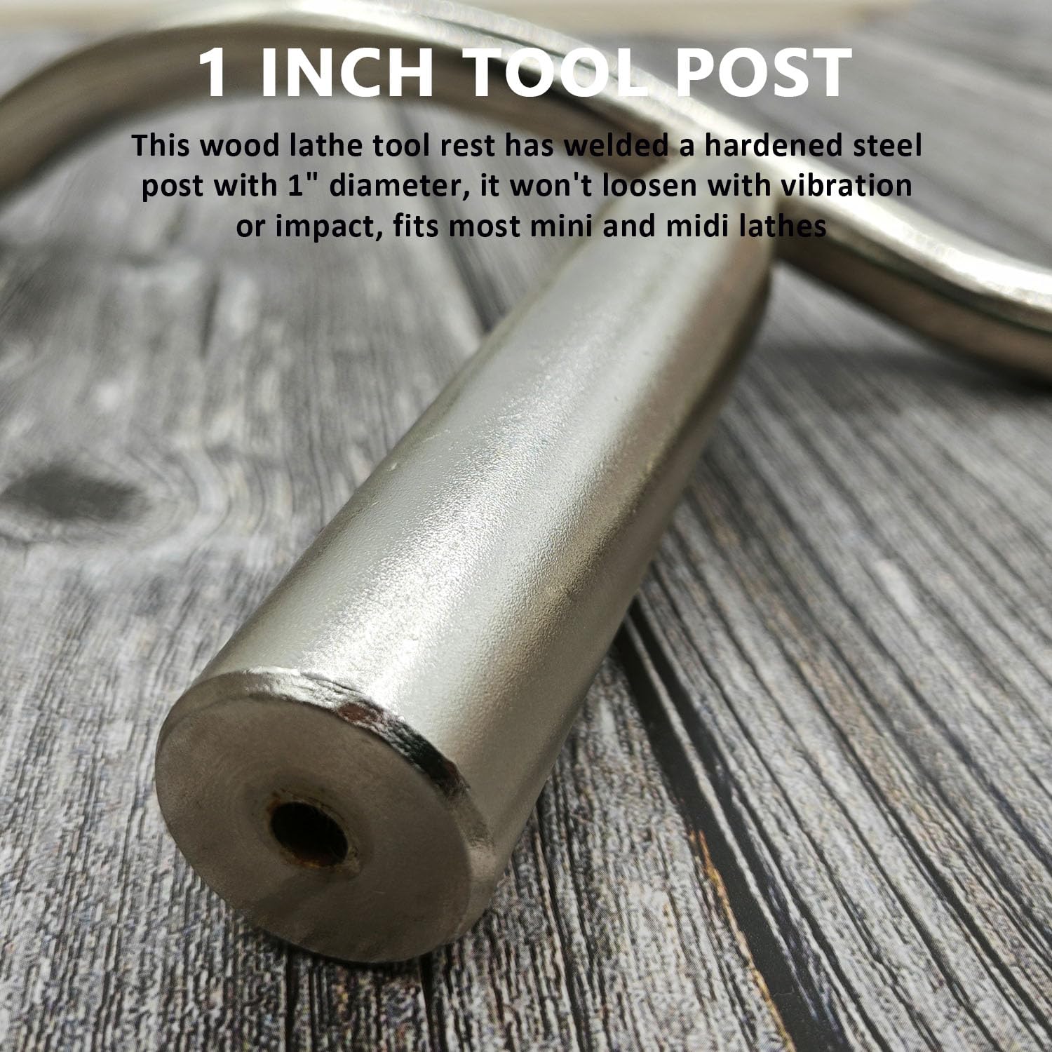 - [1 Inch Tool Post] - This wood lathe tool rest has welded a hardened steel post with 1" diameter, it won't loosen with vibration or impact, fits most mini and midi lathes
