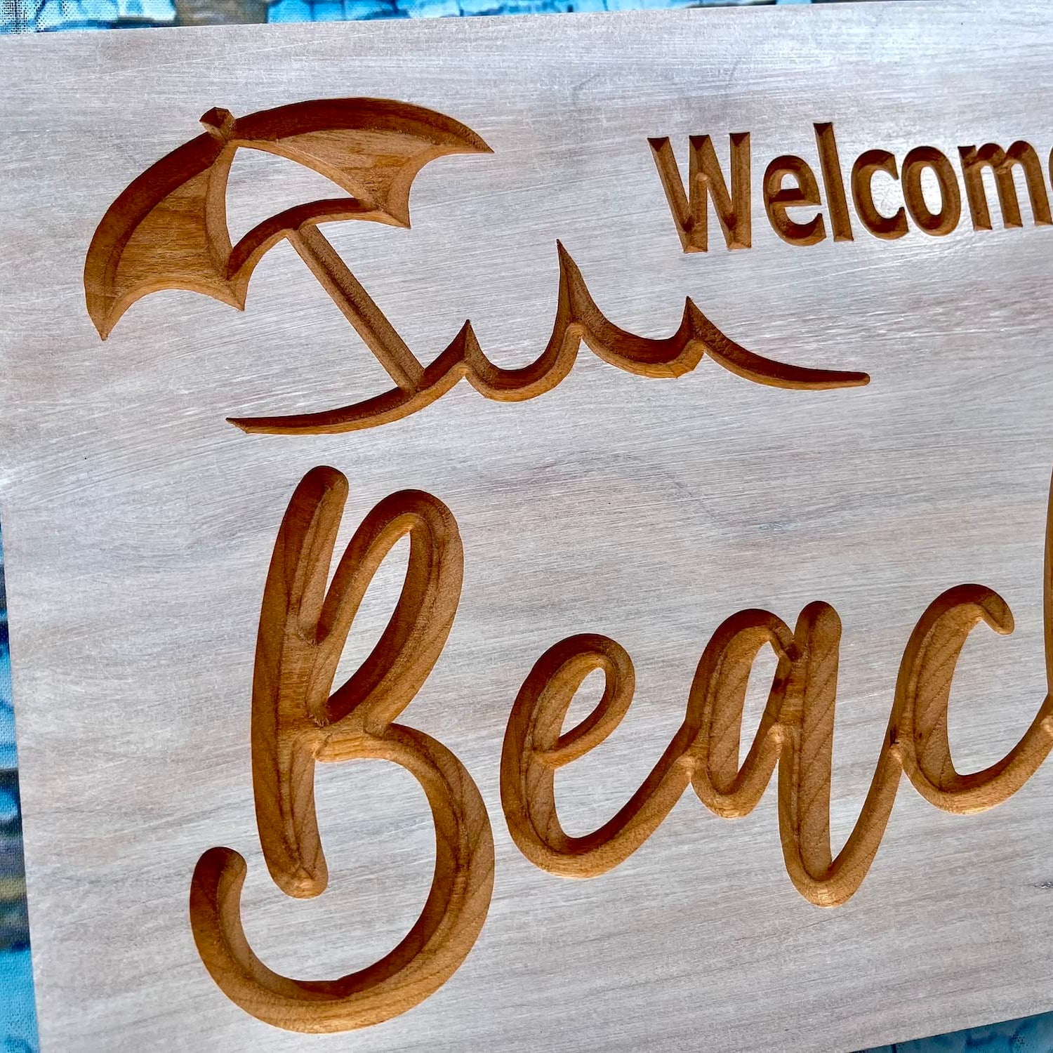 Details: How In the world would people find your beach house, lake house or cabin without one of our personalized white washed weathered signs?? Worry no longer! We can create one of these cool looking signs and personalize it just for you. These awesome signs feature an Adirondack chair, sunshine image, and an umbrella contrasted against our custom white washed background. These imaged come standard on the sign. These signs are carved from solid rot resistant mahogany and sealed for outdoor display. Both the images and your custom text are carved deeply into the wood. We never use lasar burning or cheap vinyl decals. Measures 18x7 inches with larger sizes available. No text comes standard on the sign , we only carve what you enter in te customazation section. Your sign will be formatted like our example. Each sign comes with mounting hardware. Let us create yours today.