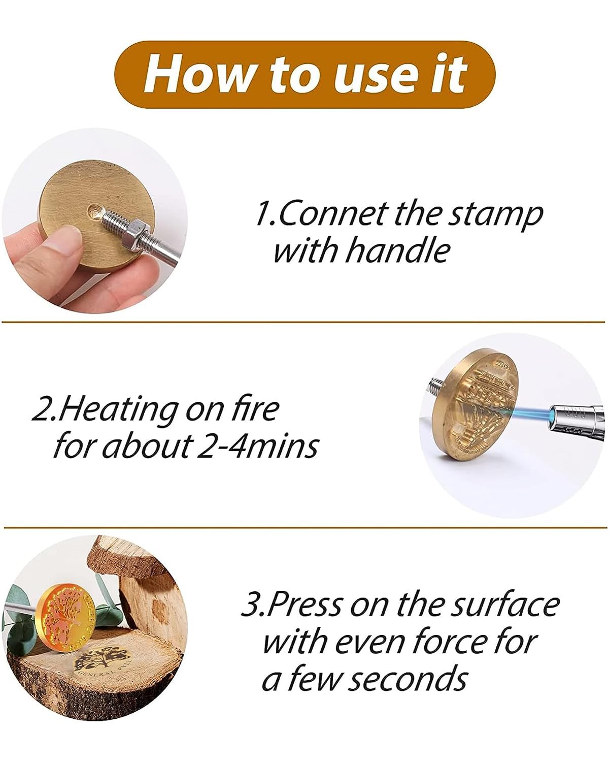 To use, simply attach the heat stamp to the wooden handle, and apply heat using a flame gun, charcoal grill, or fireplace. For best results, experiment on various materials until you achieve your desired imprint, ensuring a smooth, flat surface for optimal effects.