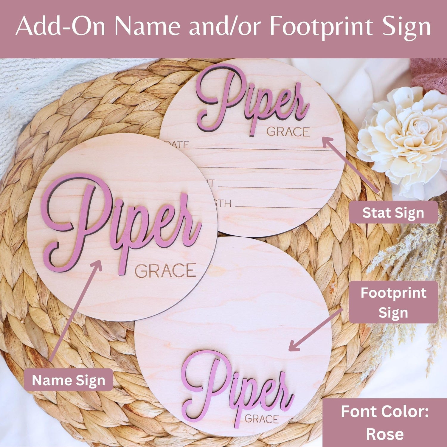 Details: Celebrate the newest addition to your family with our exquisitely crafted personalized wooden birth announcement sign! Picture the joyous moment when you first laid eyes on your precious bundle of joy—now, immortalize that moment with a stunning keepsake that captures all the love and happiness. Handcrafted with care and precision, our signs boast intricate 3D detailing and laser-engraved perfection, ensuring a truly unique and personalized touch. With 30 vibrant colors to choose from and multiple sizes available, you can tailor your sign to match any nursery decor or suit your individual style.