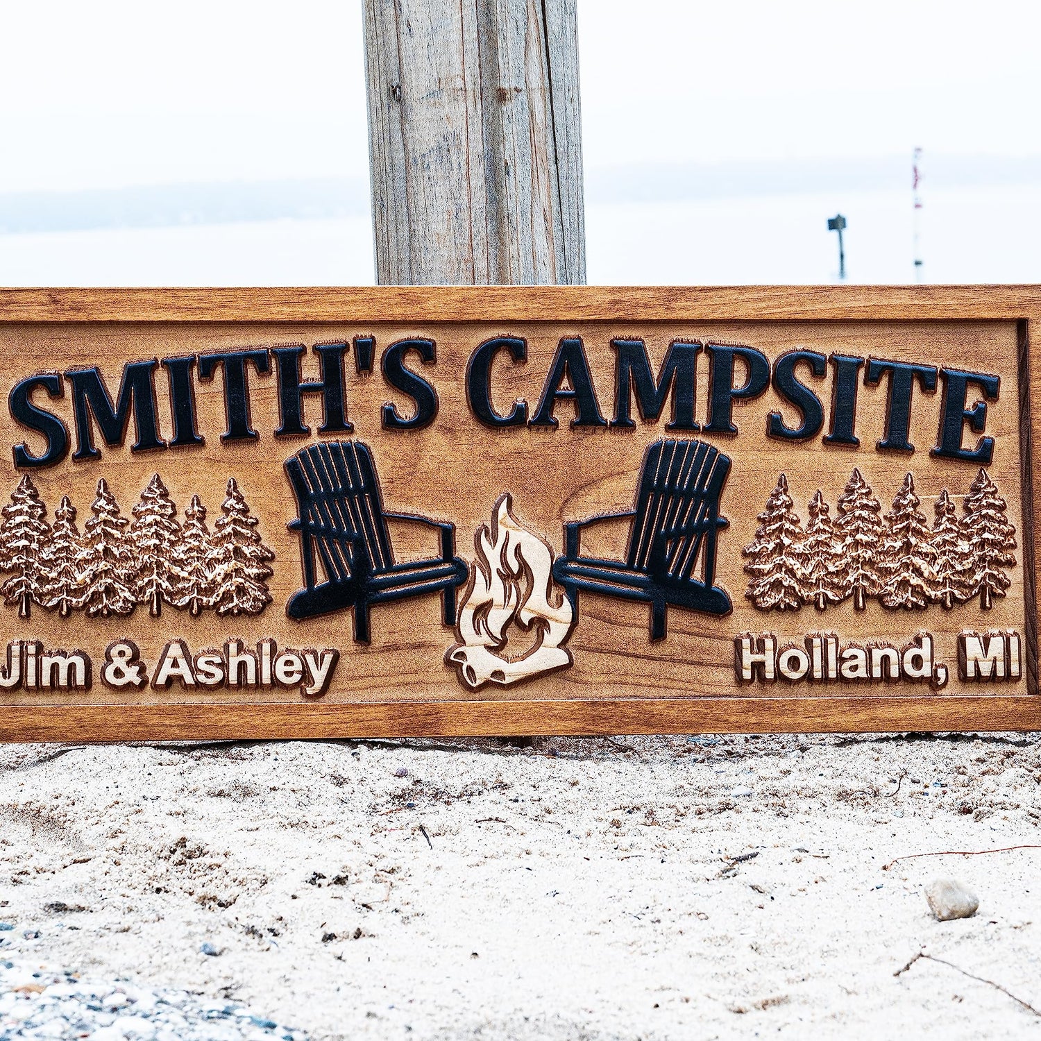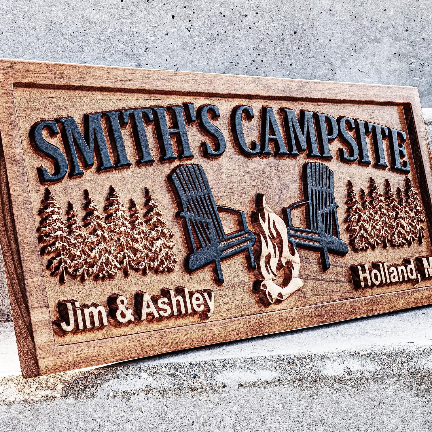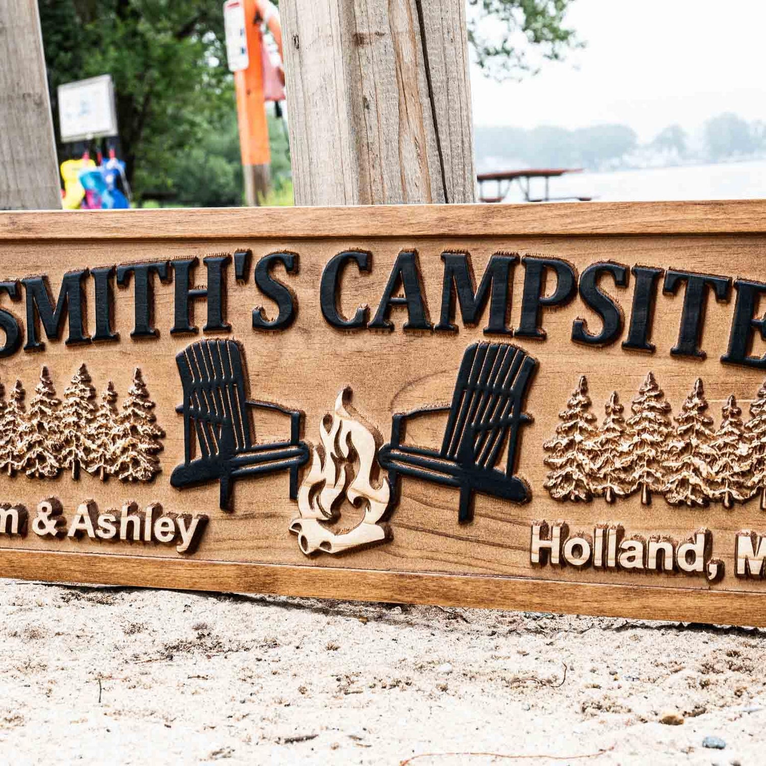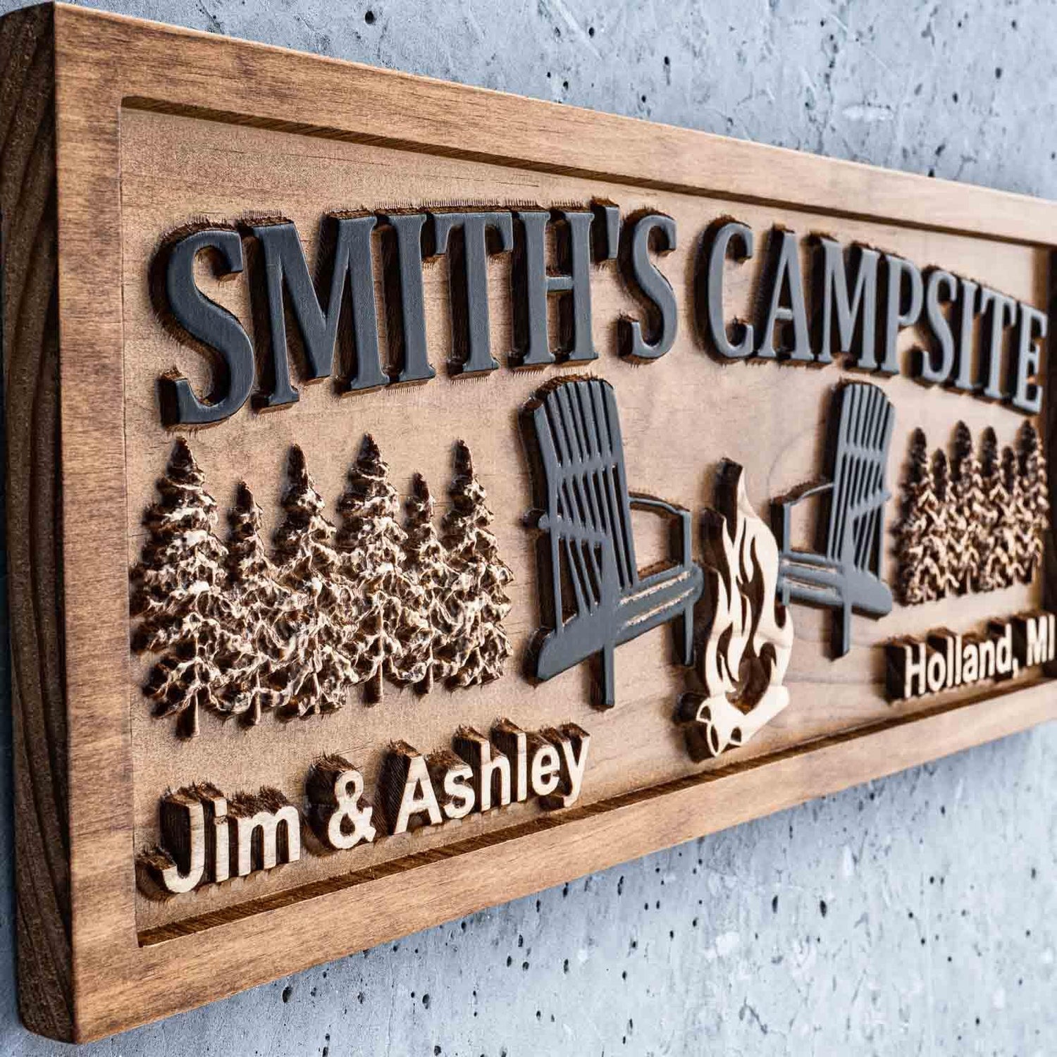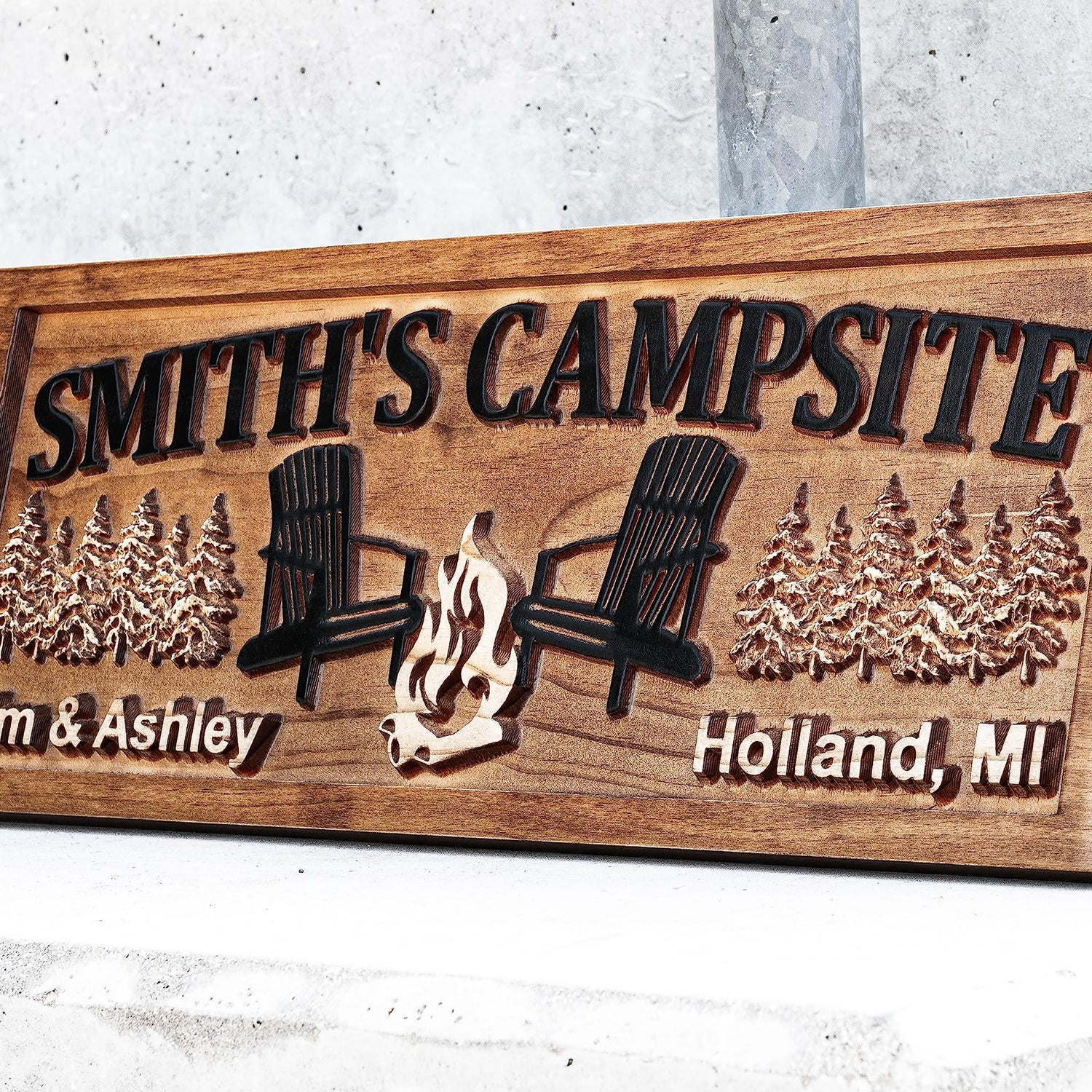 Details: Personalized wood sign with campfire, chairs, and trees! The sign carved from 3/4" Solid Pine and is made using a two tone stain finish that's finished with a sealer. Each sign includes a sawtooth hanger on the back for quick and easy hanging. Notice the 3D lettering and images that pop right out of the sign. This unique and beautifully crafted sign is truly one of a kind. Every sign is handmade out of premium quality pine. We finish our signs with an indoor/outdoor sealer but do not recommend placing outdoors in the direct elements. Provide partial protection from these elements if placed outside. Please message us if you have any questions. Thank you!
