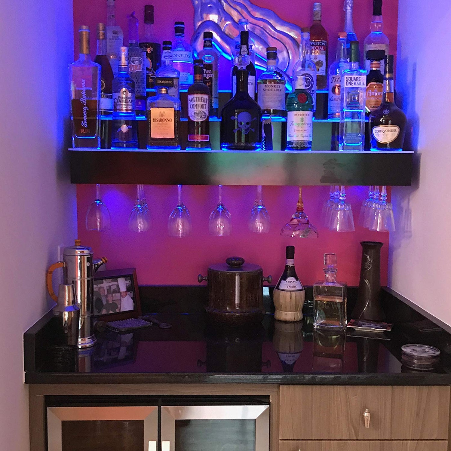 Details: Our wall mounted led lighted bar shelves with integrated wine glass racks are the perfect way to display both your wine and liquor collection along with a place to put your wine glasses. These shelves have hidden slots underneath the display for the base of the wine glass to fit into.
