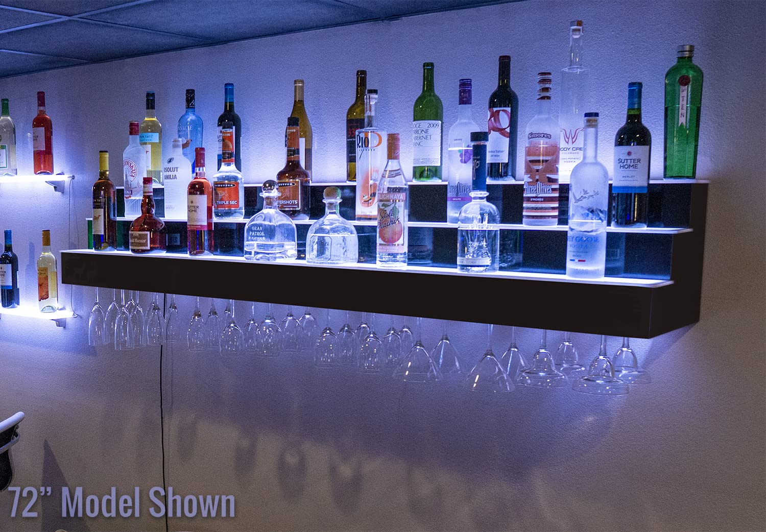 Details: Our wall mounted led lighted bar shelves with integrated wine glass racks are the perfect way to display both your wine and liquor collection along with a place to put your wine glasses. These shelves have hidden slots underneath the display for the base of the wine glass to fit into.
