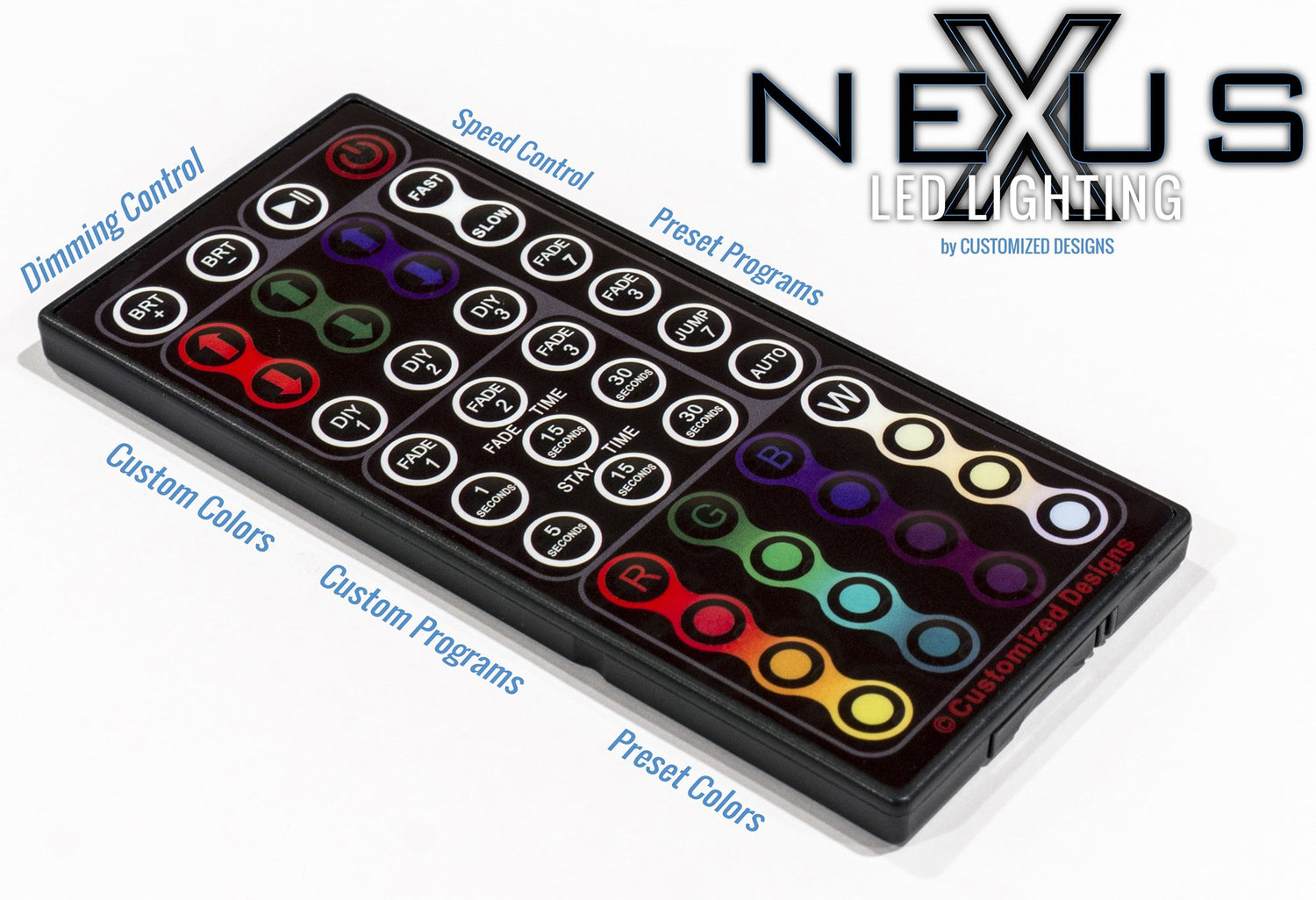 - Our one-of-a-kind Nexus LED lighting controller is included with all of our products. You can choose from pre-set colors, program your own custom colors and even program your own color changing sequences. Great for holidays and sports teams. Fourth of July? Easily program in a Red, White and Blue program!