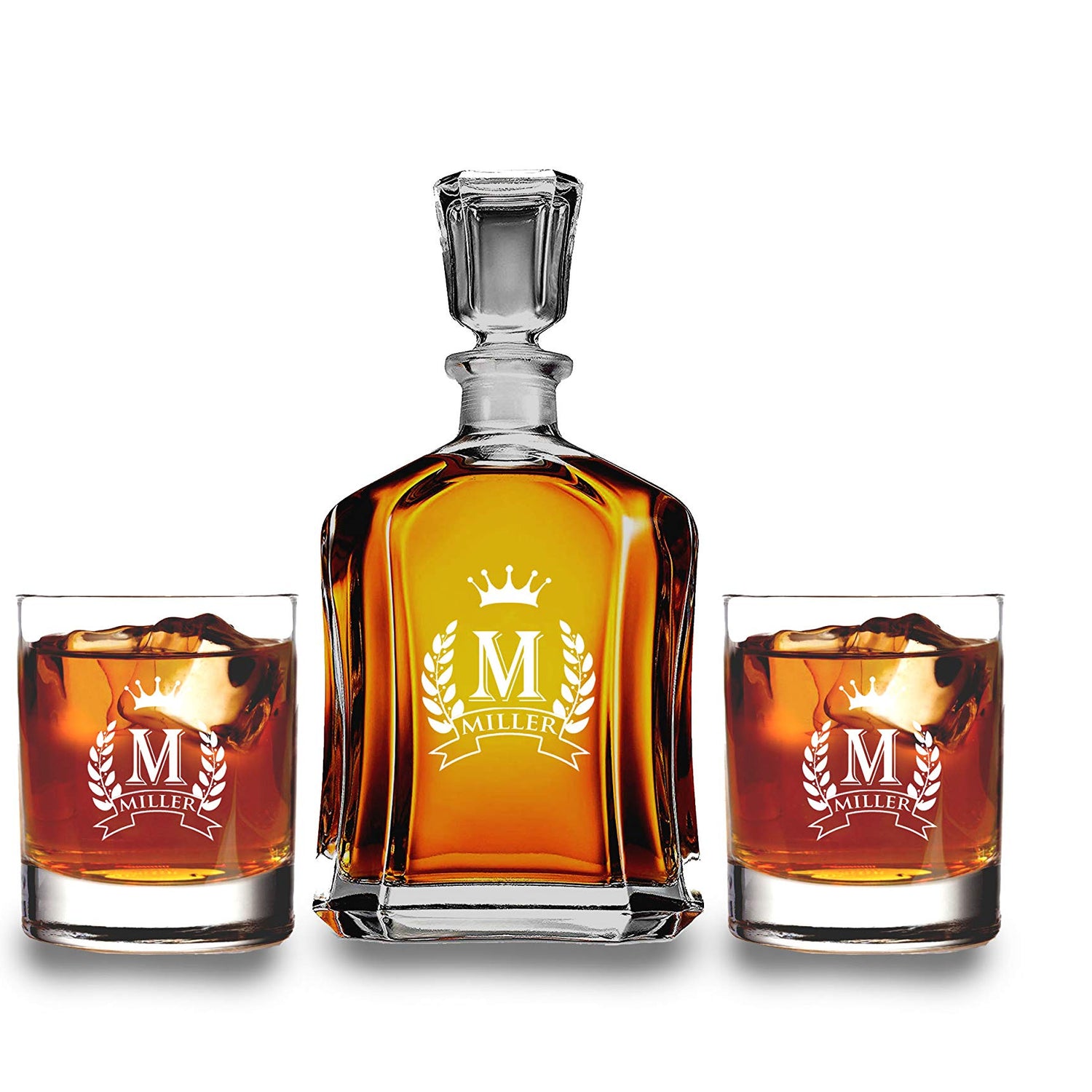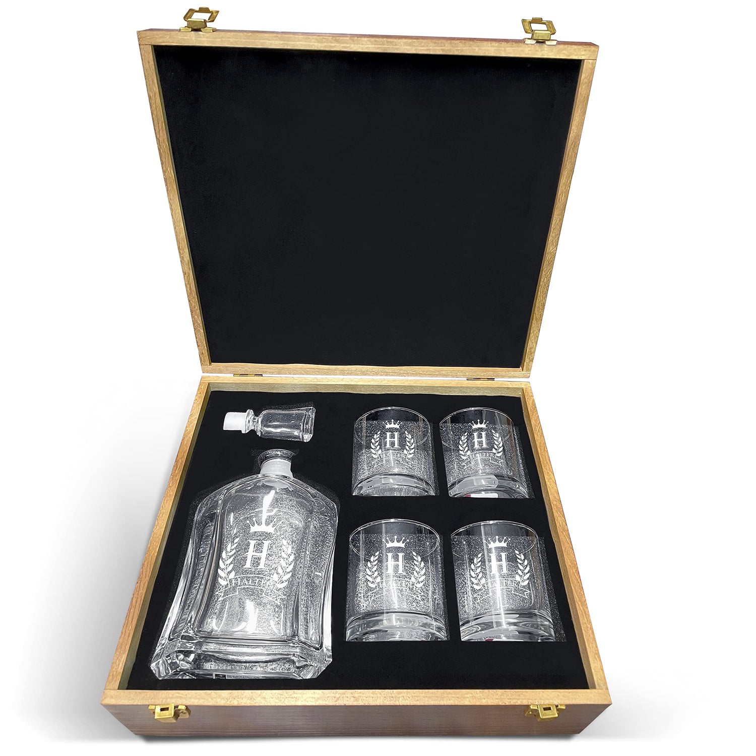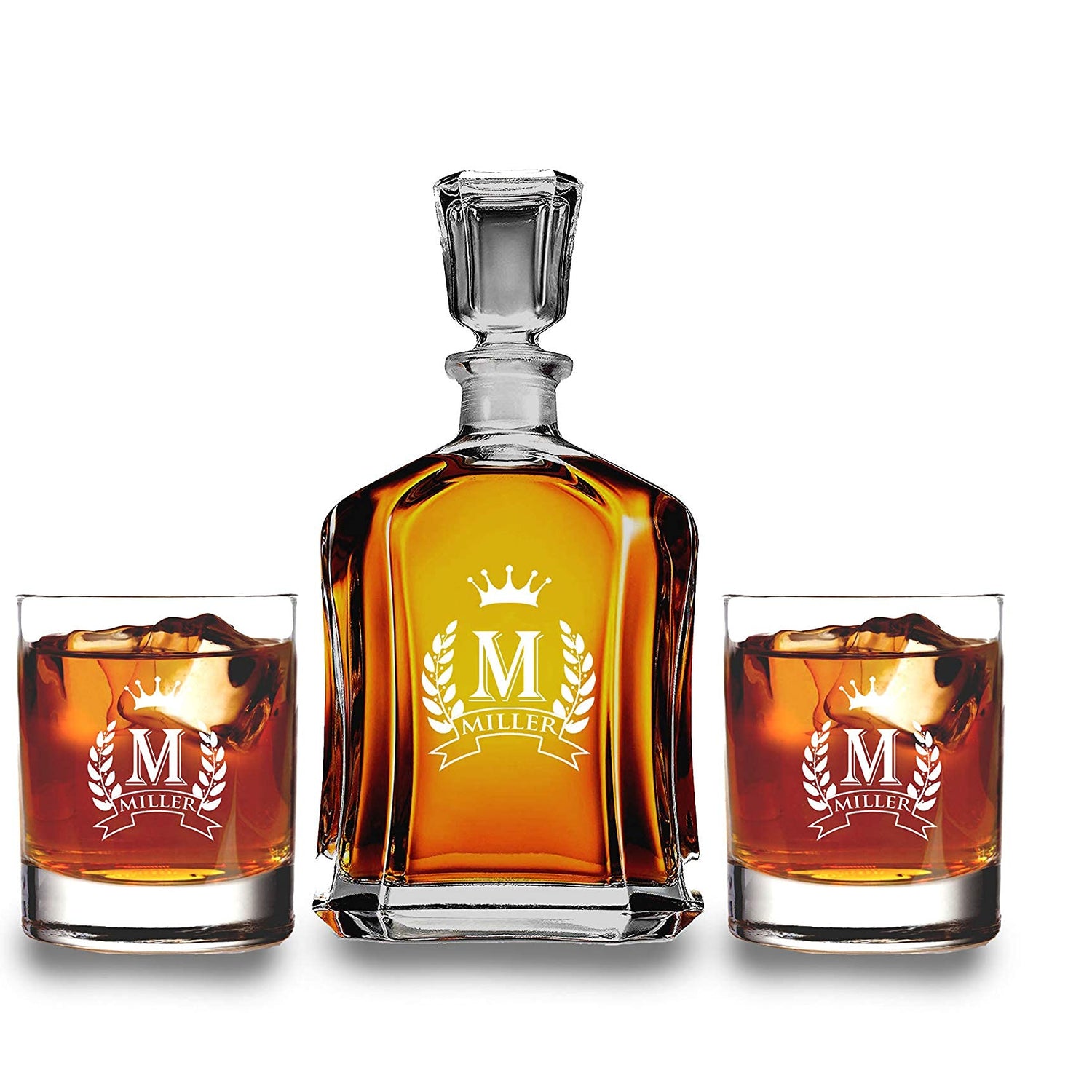 Customized Monogrammed Whiskey Decanter Set - 2 Glasses, Engraved Shield Crown Design - Wedding Decanter with Wood Box