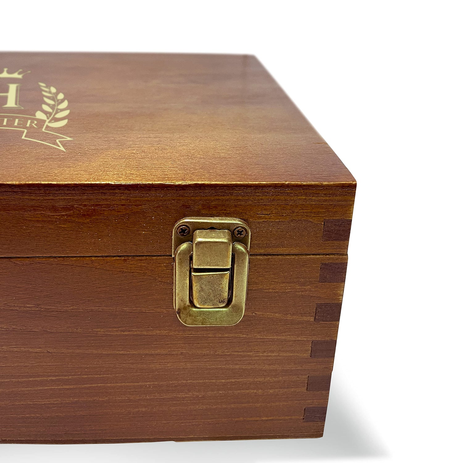 - Our exquisite wine decanter Decanter will hold 23 oz of liquid and has option for 4 Whiskey glasses with it. Personalized and Laser Engraved as per need and made in USA. Wooden Box size is 15.5inch X 12.5inc X 4 inch. Great addition to your barware