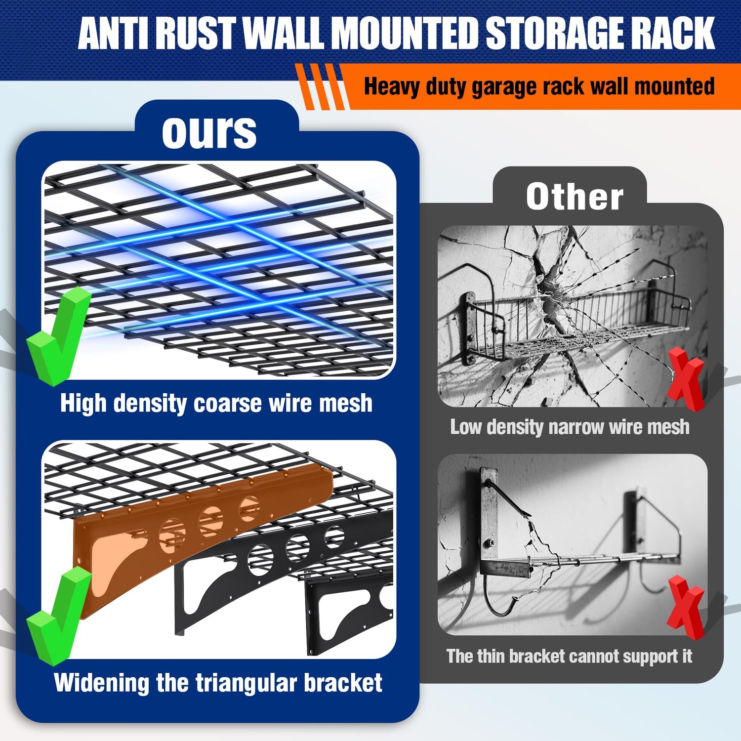 - 1. Sturdy and Durable: This garage shelving wall mounted is crafted from premium steel. Its high-density metal mesh paired with triangular supports scientifically distributes pressure. Properly installed on walls, this 2×6 ft garage wall shelf holds up to 600 lbs! Through professional testing and extensive market research, we’ve found that this wall shelf has 3-5 more steel wires than comparable products, delivering far superior load capacity. The rack will never bend, wobble, or sag.