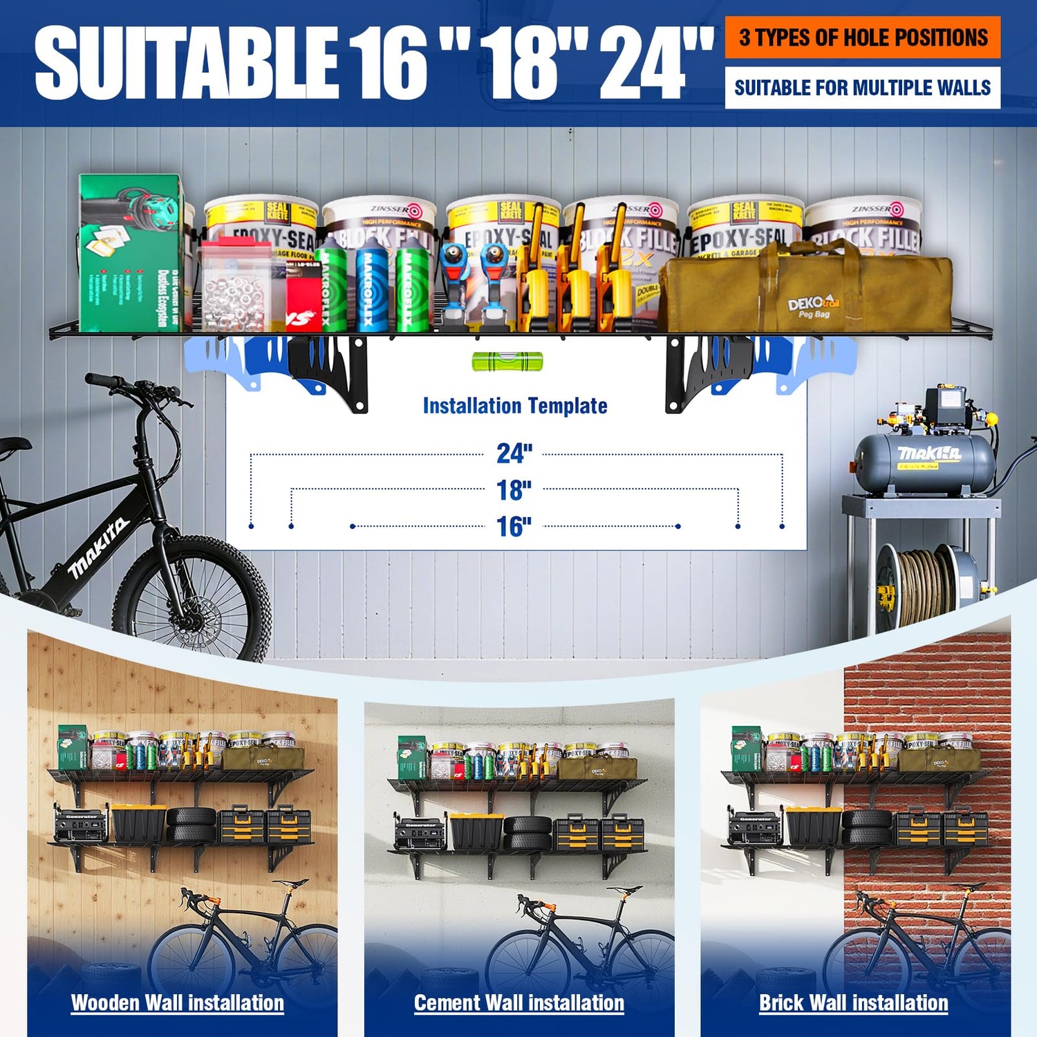 - 3. Simple Installation: When you purchase our garage wall shelf, we thoughtfully include a professional leveling tool for precise calibration, ensuring your rack is securely installed and aesthetically pleasing. Paired with the installation positioning template, simply align the template with the wall, mark the drilling locations, and quickly complete the positioning—greatly simplifying the installation process. Even if you have no installation experience, you can easily set up this practical wall shelf with the help of these included accessories.
