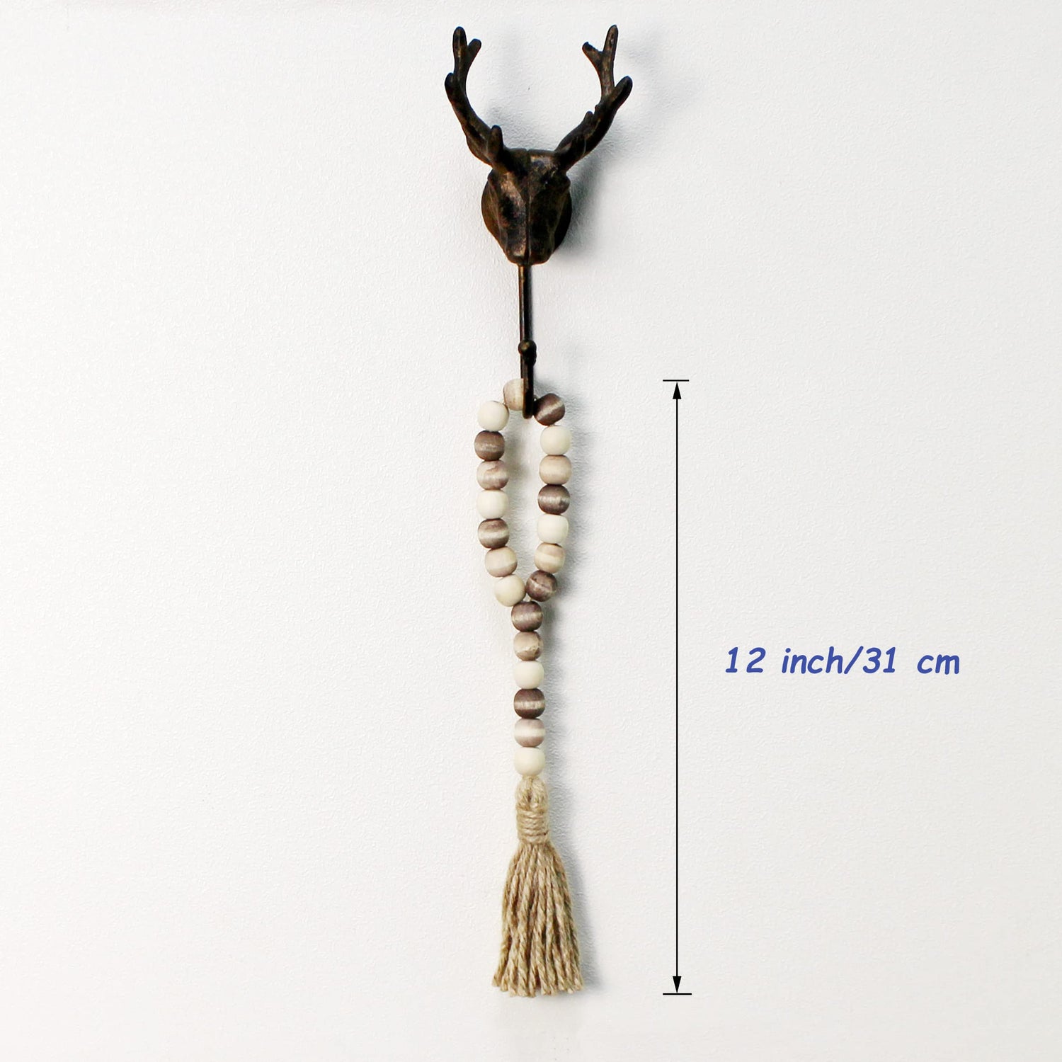 - Measures: total length is 12", the diameter of wooden beads is 5/8"(16 mm), 2-1/2" diameter Loop, mix distressed beads finish