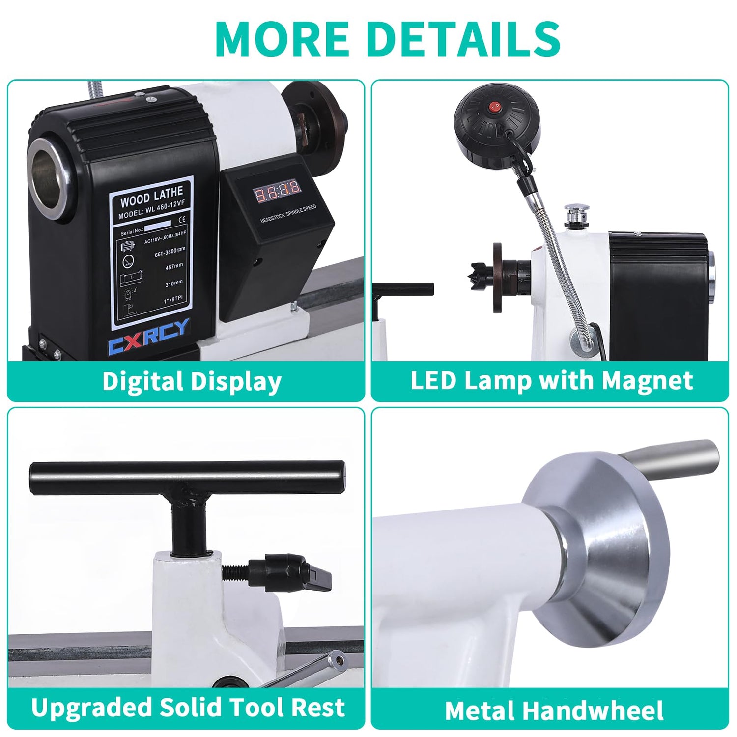 CXRCY 12" x 18" Wood Lathe, Powerful Benchtop Wood Lathe Machine 3/4 HP Infinitely Variable Speed 650-3800 RPM with Lathe Belt & Goggle for Woodworking, Woodturning (Model:WL460-12VF)