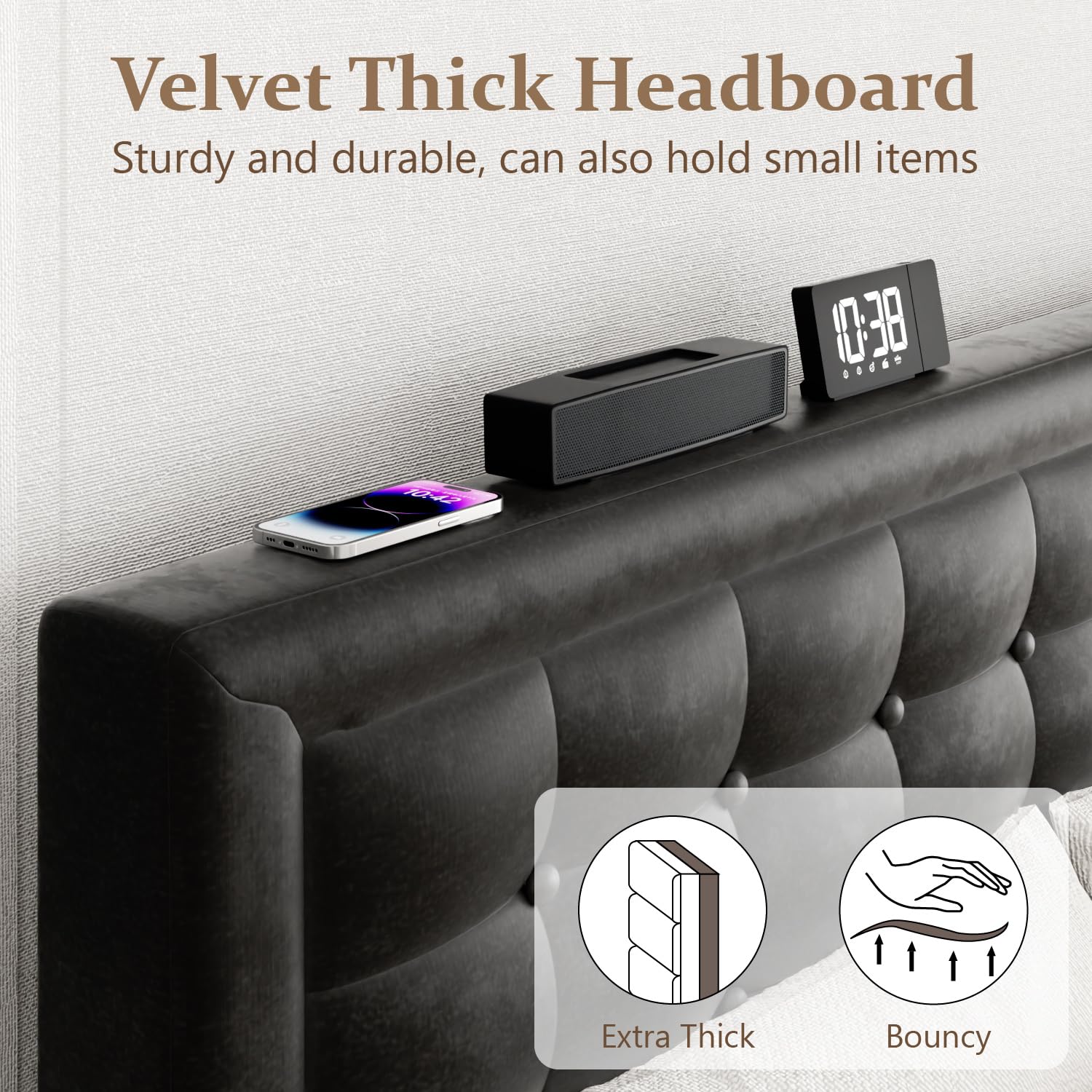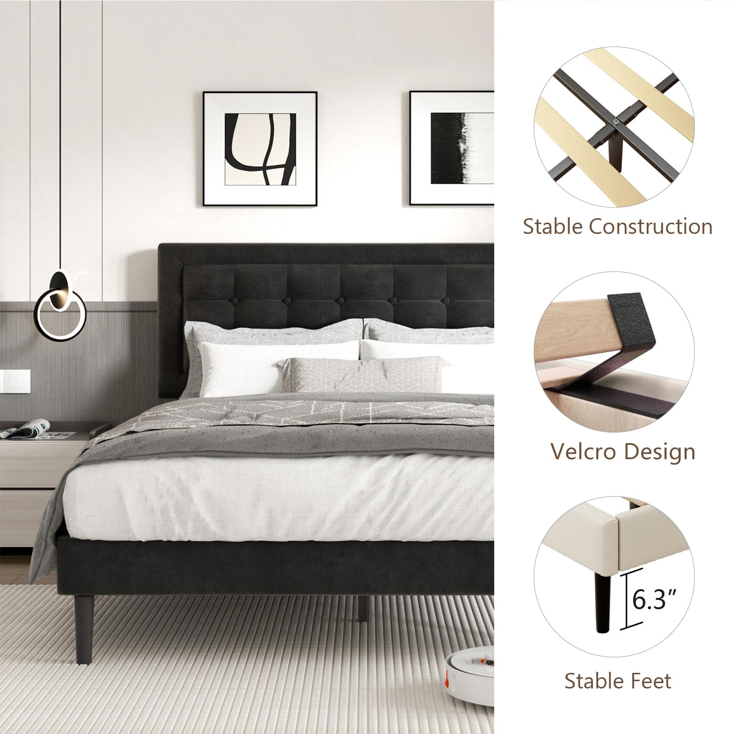 CXVX Queen Size Bed Frame with Headboard, Platform Bed Frame with Velvet Upholstered Button Tufted Headboard, Wood Slats Support, No Box Spring Needed, Mattress Foundation, Easy Assembly, Black