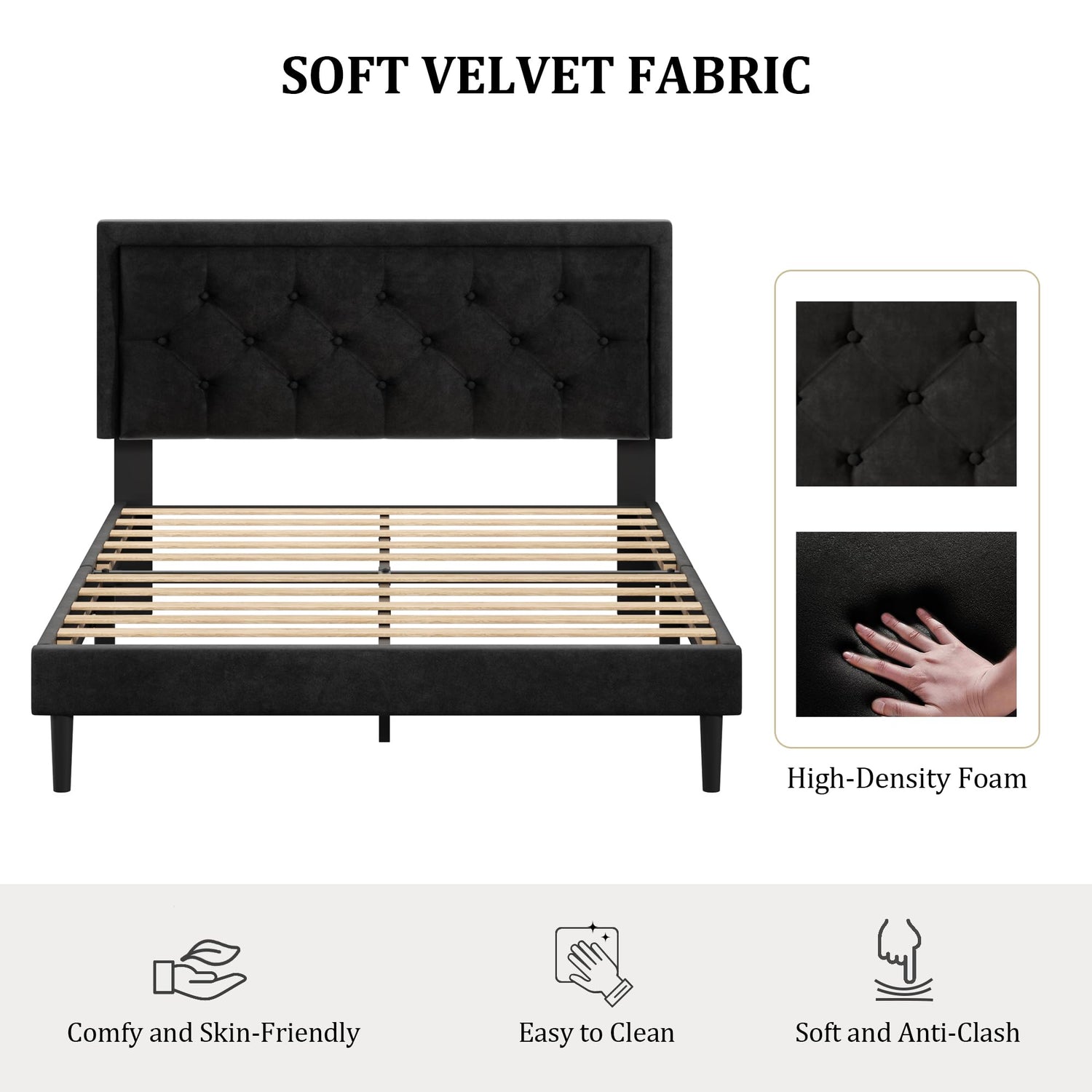CXVX Queen Size Platform Bed Frame with Upholstered Velvet Button Tufted Headboard, Mattress Foundation with Wooden Slat Support, No Box Spring Needed, Easy Assembly, Noise Free, Black
