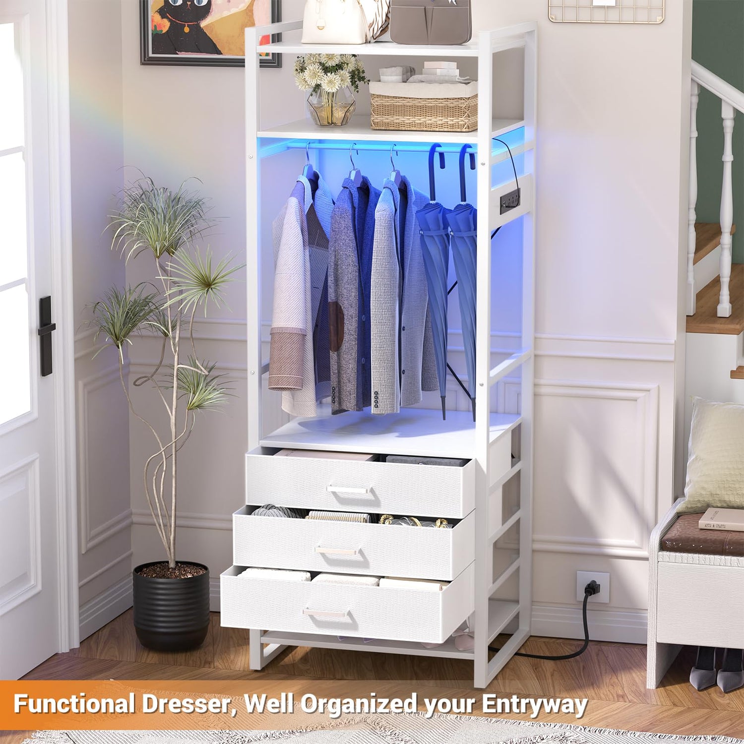 - 🩳【Magical Clothing Rack with Charging Station & LED Lights】 This functional clothing rack has built-in 3 plugs and 2 USB ports beside the dresser which can be installed on the left or right side. If you put it beside your bed or any place, you can charge devices conveniently. This dresser is also equipped with 6000+ colors of LED light strips, you can DIY any colors, and create unbeatable storage space while making a lame space a scrumptious one.