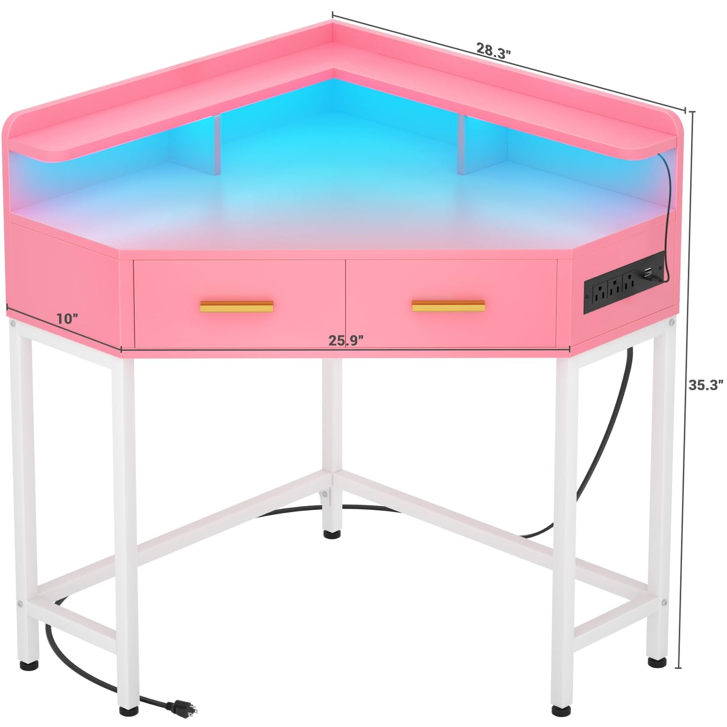 Cyclysio Corner Vanity Desk Without Mirror, Makeup Vanity Table with Lights & Power Outlets, Small Corner Vanity with Drawers for Bedroom,Small Spaces, Pink