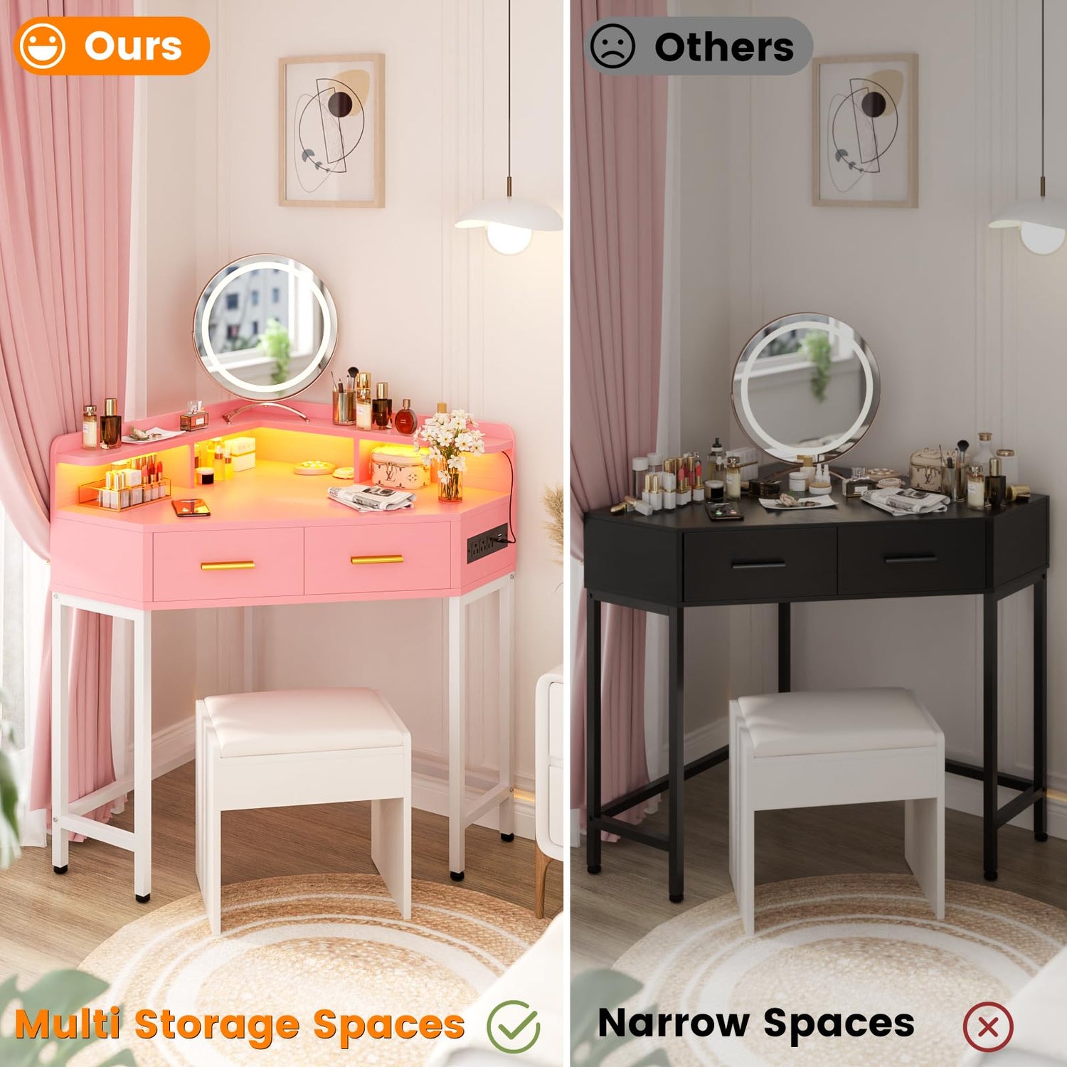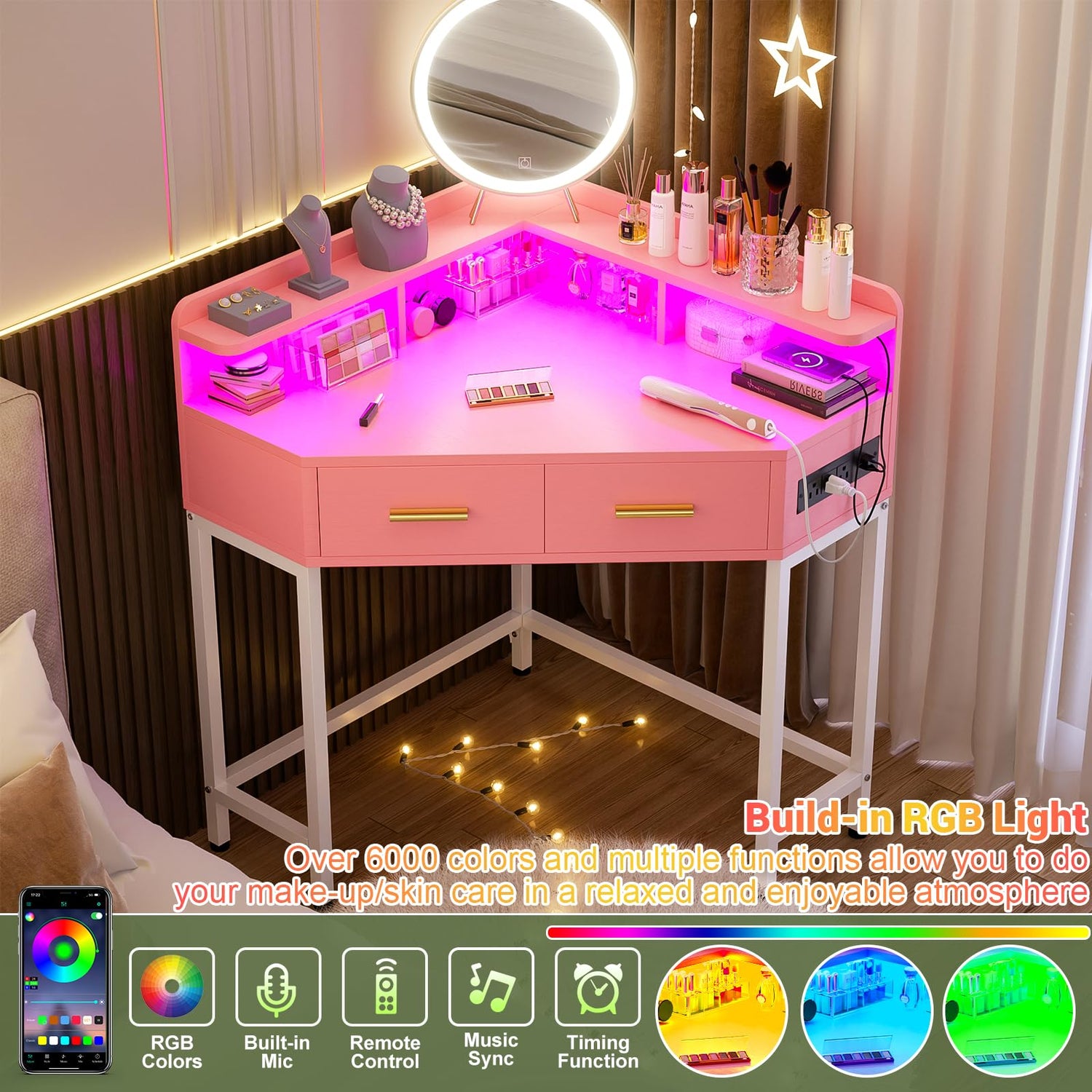 - 【Corner Makeup Vanity with LED Light】RGB light of the dressing table has over 6000 colors with music synchronization, memory function and support for color DIY via the APP, allowing you to do your make-up/skin care in a relaxed and enjoyable atmosphere!