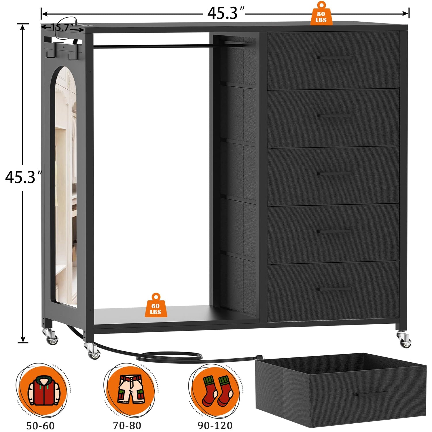 Cyclysio Dresser for Bedroom with Clothes Rack & Mirror, Black 5 Drawers Dresser with Charging Station & LED Lights, Rolling Chest of Drawers with Wheels, Full Length Mirror, Wooden Top,Bedroom,Closet