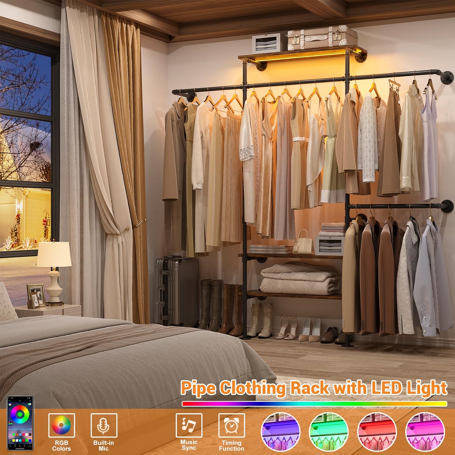 - 【Clothes Rack with Cool LED Lights】This industrial style closets shelf is equipped with RGB LED lights, which are colorful, with more than 20 colors and multiple flashing modes for you to choose from. It has a memory function that keeps the last LED light mode when it is turned on. You can pick clothes in a relaxing and pleasant atmosphere with lights and music