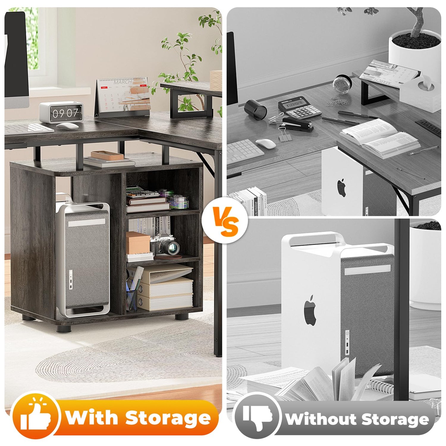 - 💚【L Shaped Computer Desk with Cabinet 】 This 58'' extra large computer desk has a 3-tir open shelves cabinet which is made of durable sturdy wood and can be used for a longer time than others that are made of fabric, easily broken. The cabinet also with a convenient mainframe, so you can organize your main very well, and don't need to find another place to place it. The wood structure makes the desk more stable and durable than others. With it you can well organize your workspace with no worry.