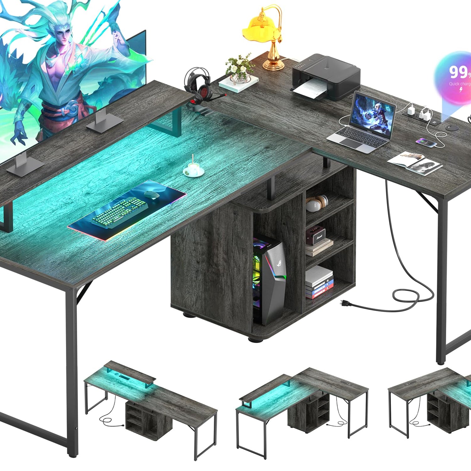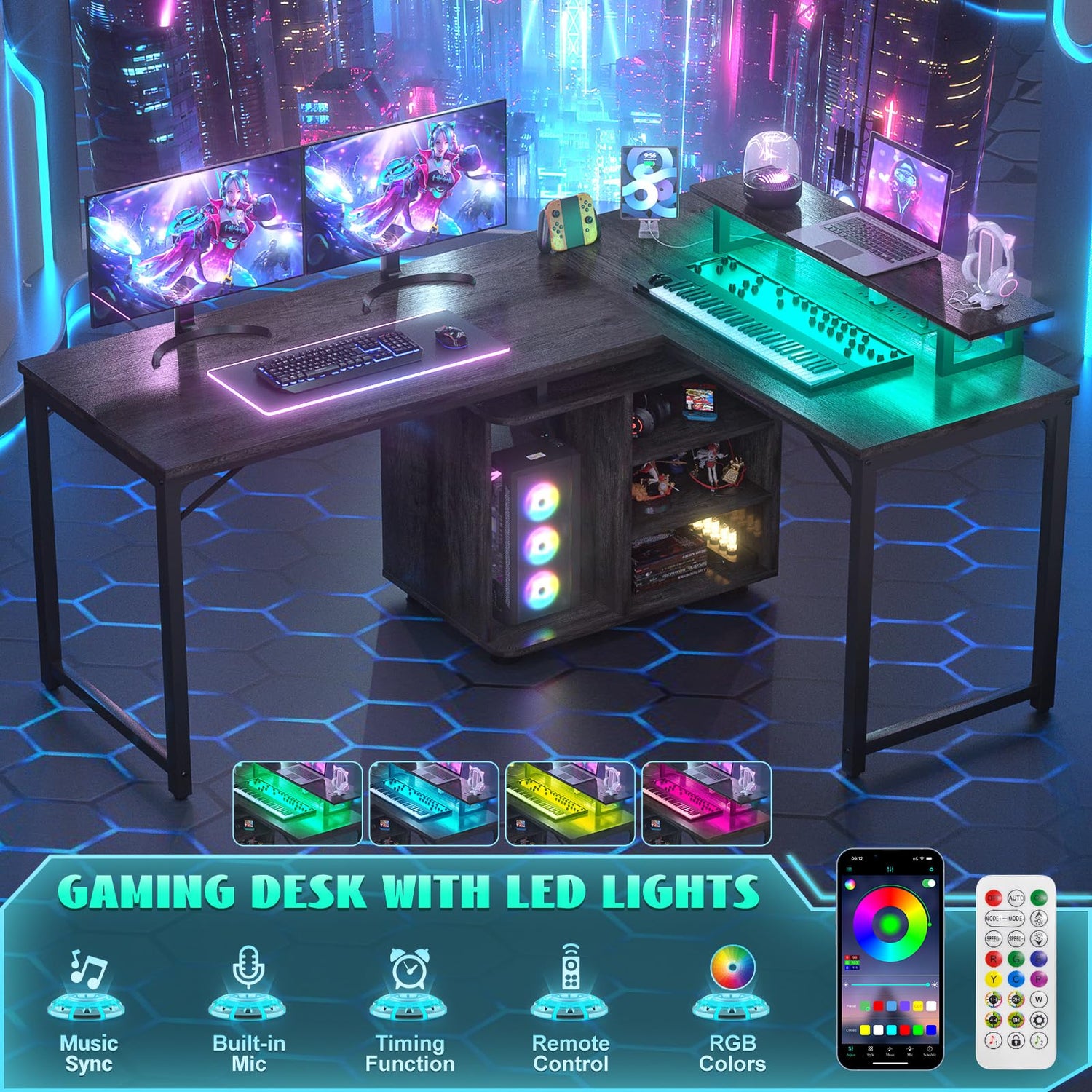 Cyclysio L Shaped Gaming Desk with Wood Cabinet, 58" Large Corner Desk with LED Lights & Power Outlet, Reversible Computer Desk with Monitor Stand, Home Office Desk 2 Person Corner Desk, Grey Oak