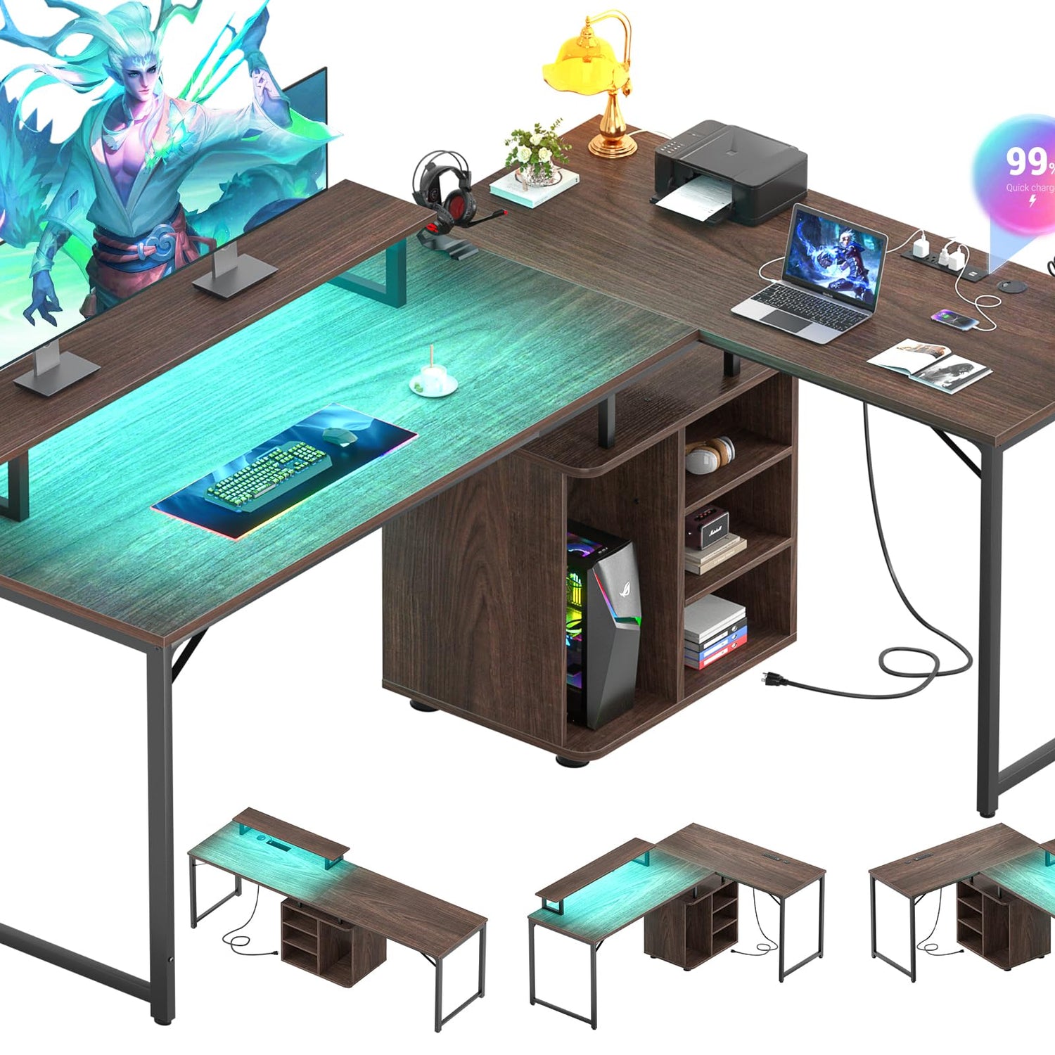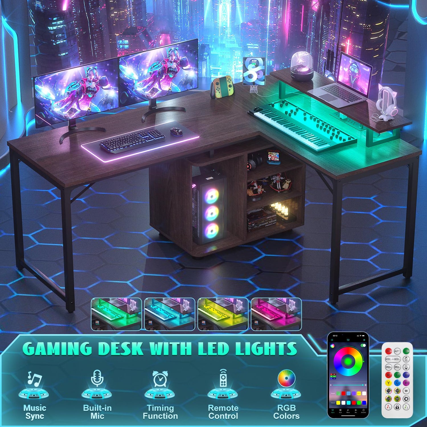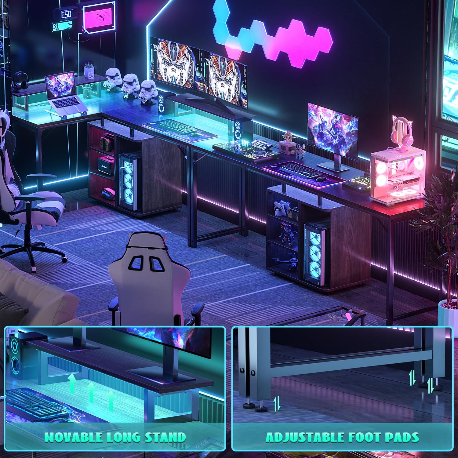 Cyclysio L Shaped Gaming Desk with Wood Cabinet, 58" Large Corner Desk with LED Lights & Power Outlet, Reversible Computer Desk with Monitor Stand, Home Office Desk 2 Person Corner Desk,Rustic Walnut