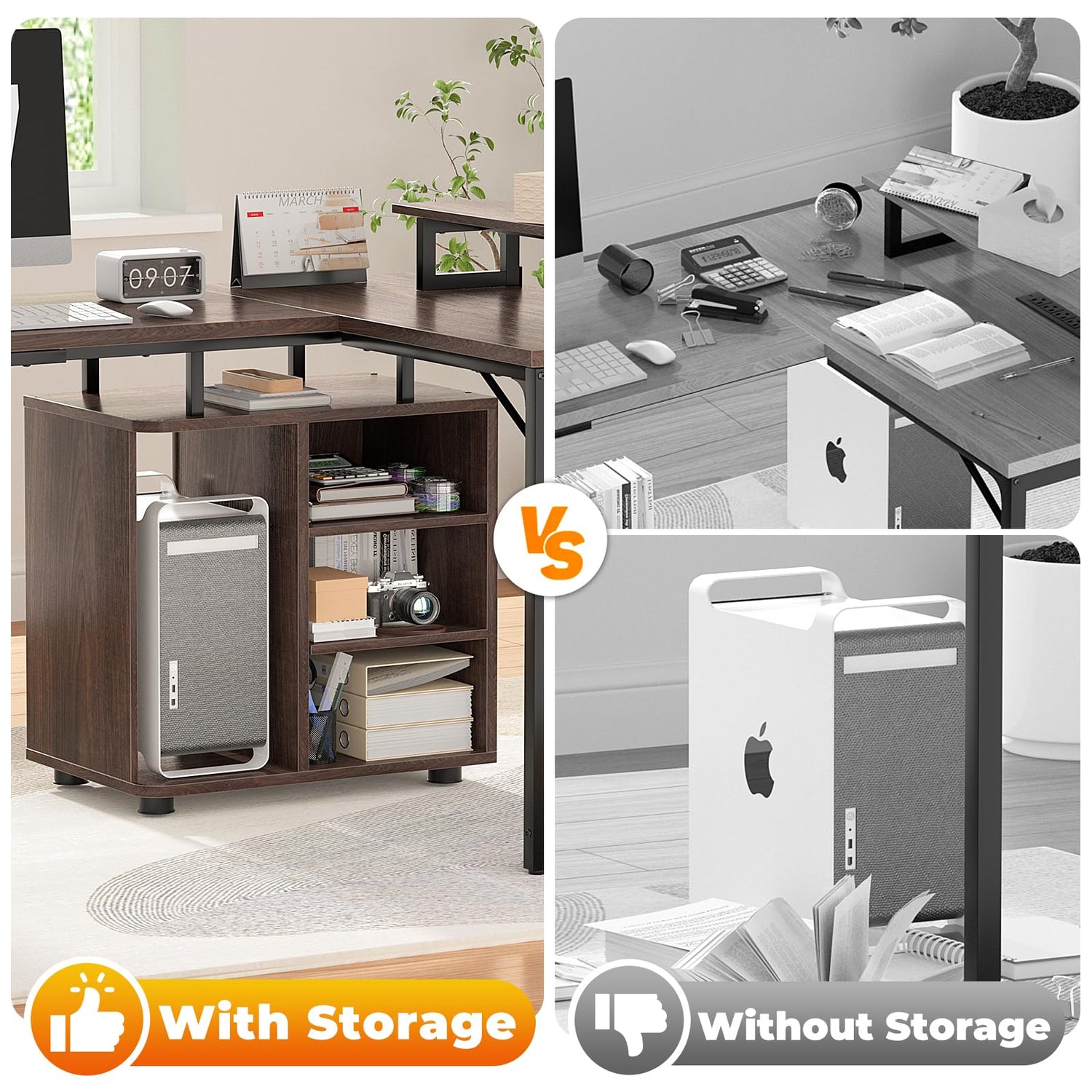 - 💚【L Shaped Computer Desk with Wood Cabinet 】 This 58'' extra large computer desk has a 3-tir open shelves wood cabinet which is made of durable sturdy wood and can be used for decades than others that are made of fabric which is easily broken. The cabinet also has a convenient mainframe stand so that you can organize your main very well, and don't need to find another place to place it. With it you can well organize your workspace, keep your desktop clean and tidy!