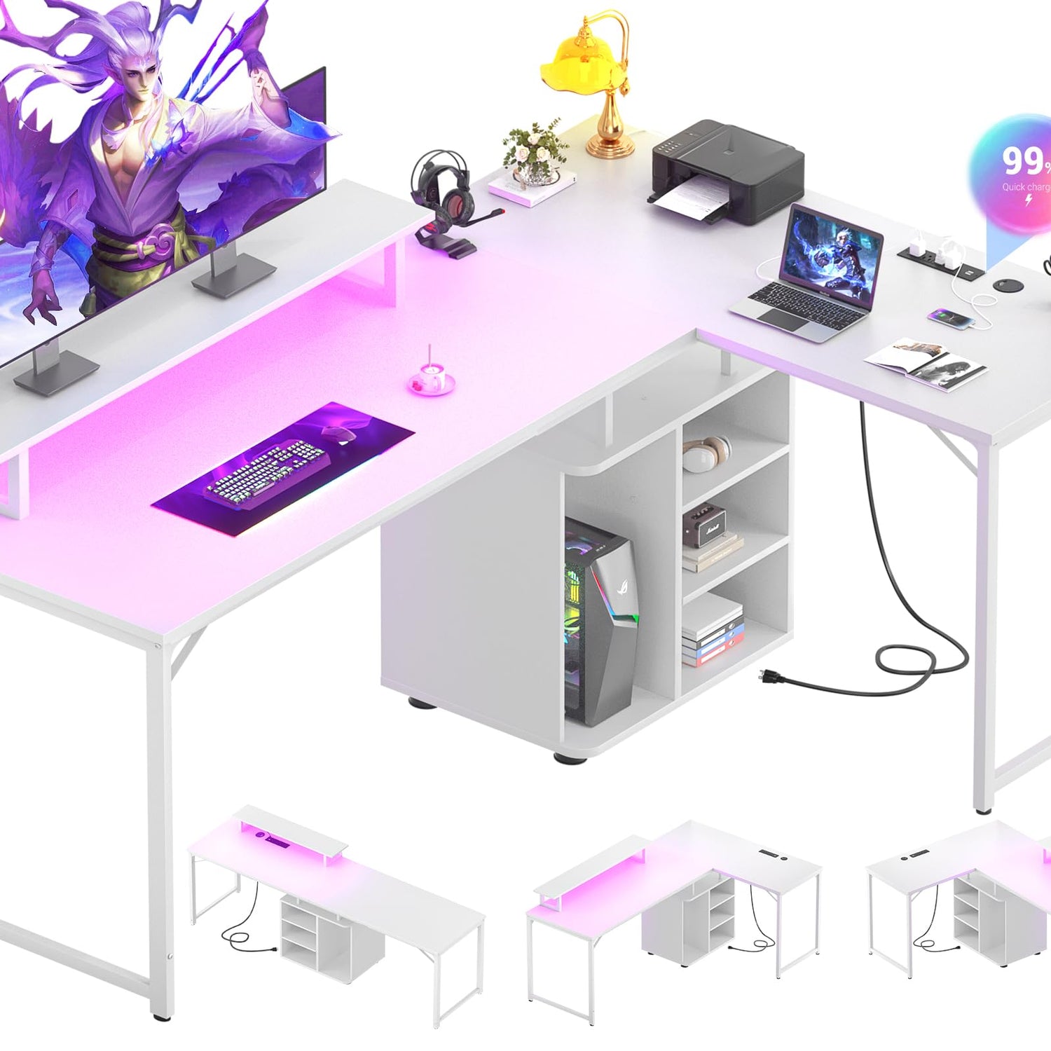 Cyclysio L Shaped Gaming Desk with Wood Cabinet, 58" Large Corner Desk with LED Lights & Power Outlet, Reversible Computer Desk with Monitor Stand, Home Office Desk 2 Person Corner Desk, White
