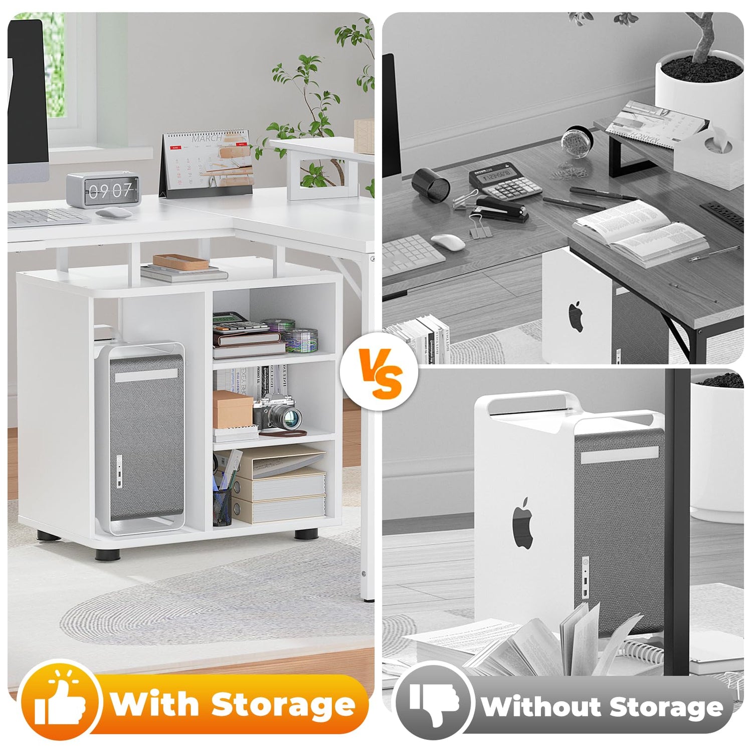 - 💎【 L Shaped Computer Desk with Cabinet & Movable Monitor Stand】: This extra large computer desk has a 3-tir open shelves cabinet to store items with a backplane to prevent items from falling to the back. The main frame can ensure your PC has a proprietary position, making the cords around it more organized, and not messy. The long monitor stand allows you to use it flexibly in any place, with a more ergonomic posture to work or gaming, effectively preventing hunchback and neck pain.