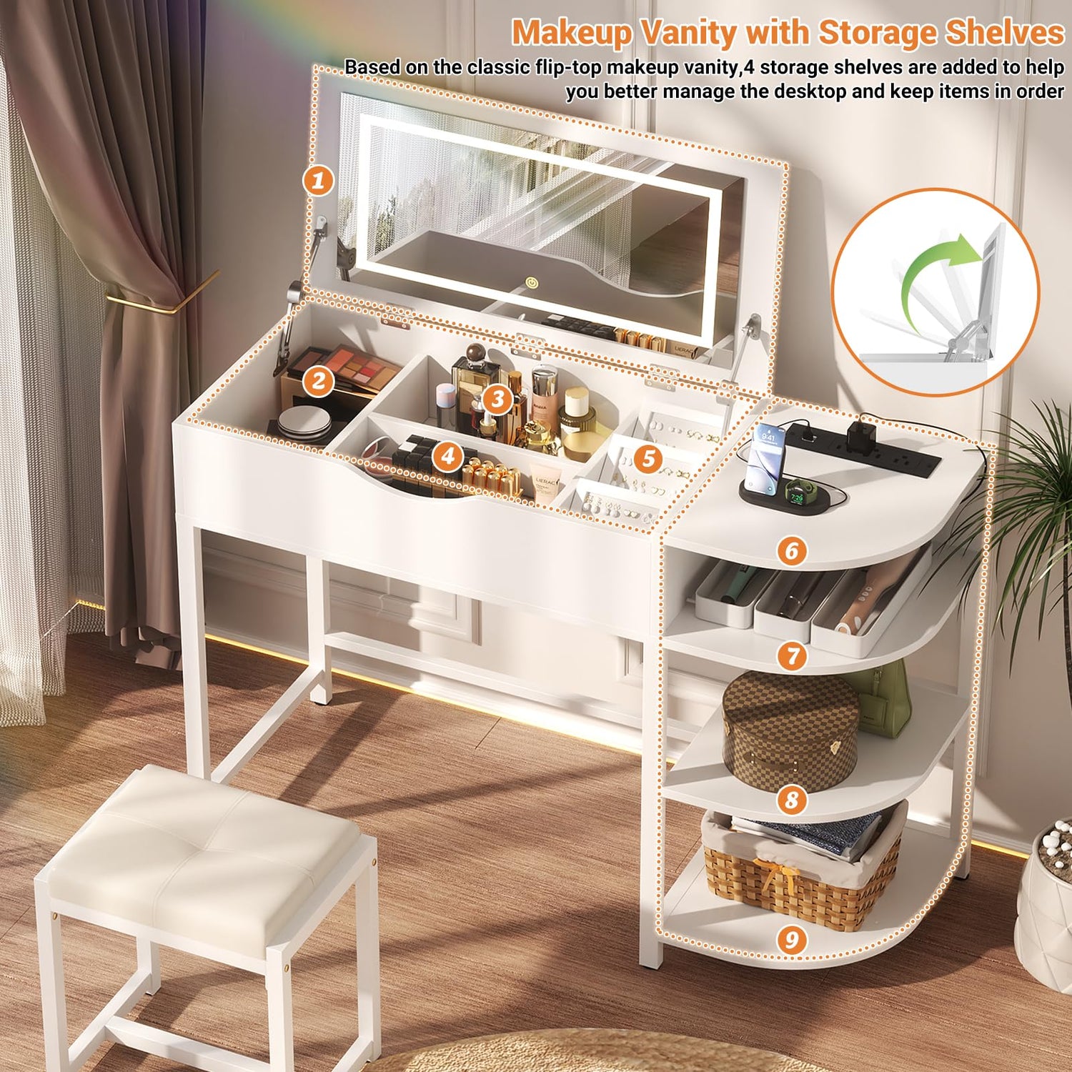Cyclysio Vanity Desk with Flip Top Mirror and Lights, Makeup Vanity Desk with Drawers, Dressing Table with Storage Shelves & Charging Station, Small Vanity for Small Spaces, White