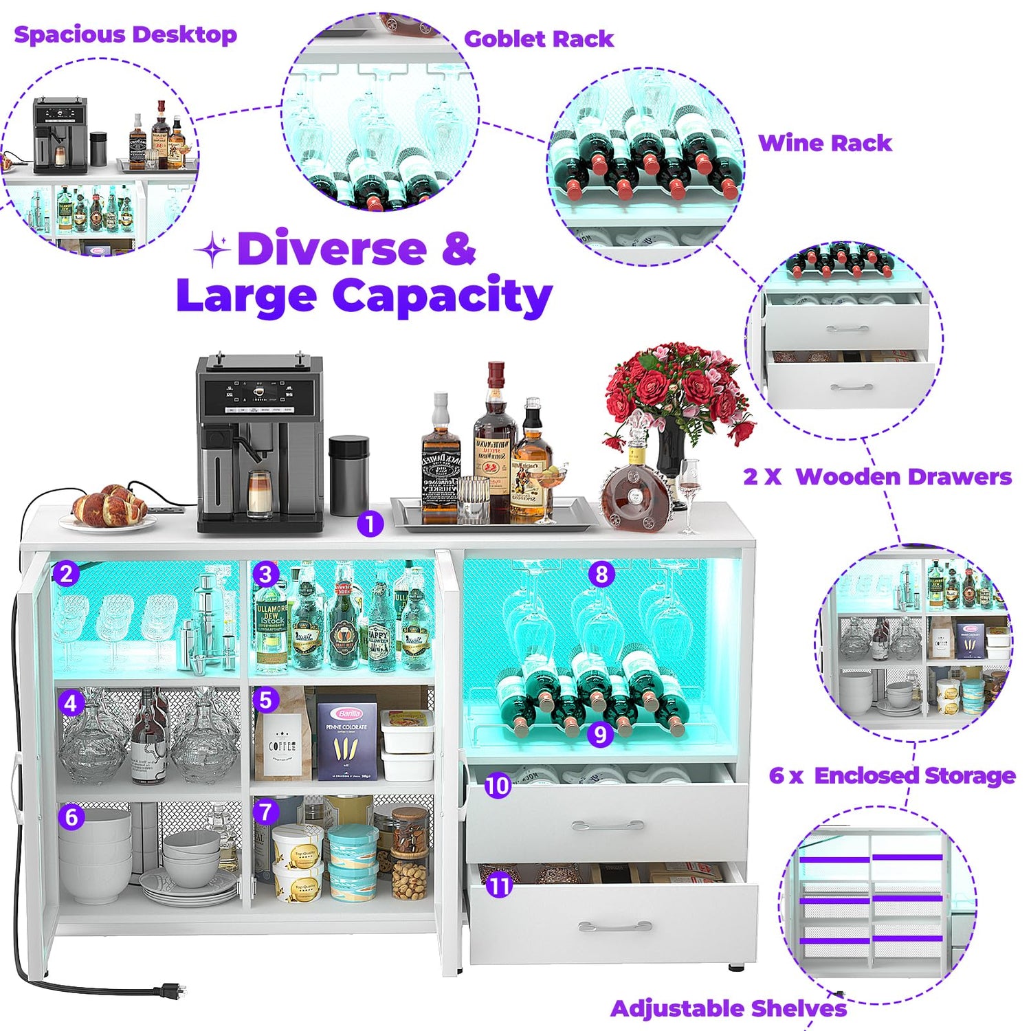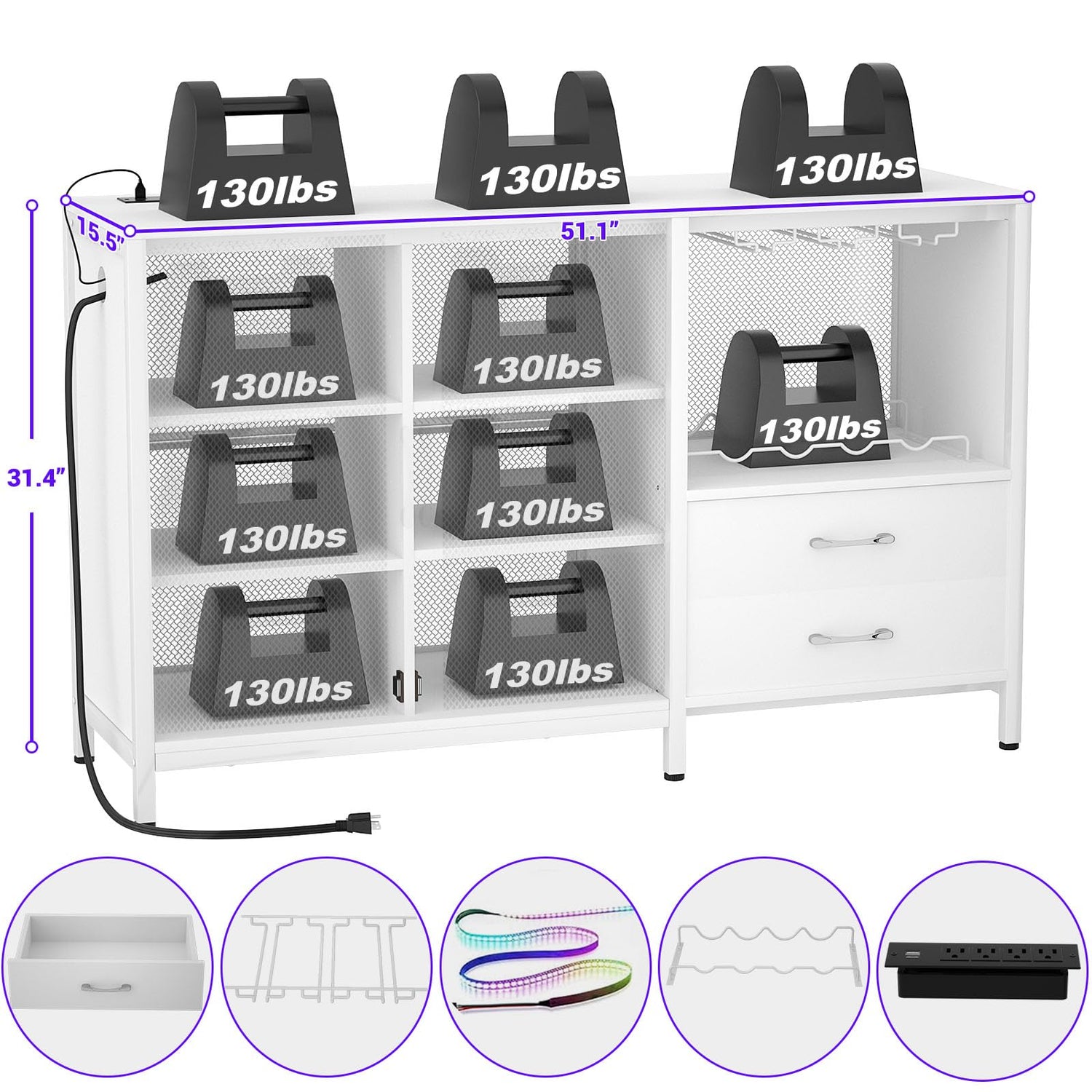 Cyclysio Multifunctional Wine Bar Cabinet with Charging Station, LED Lights and Ample Storage in White