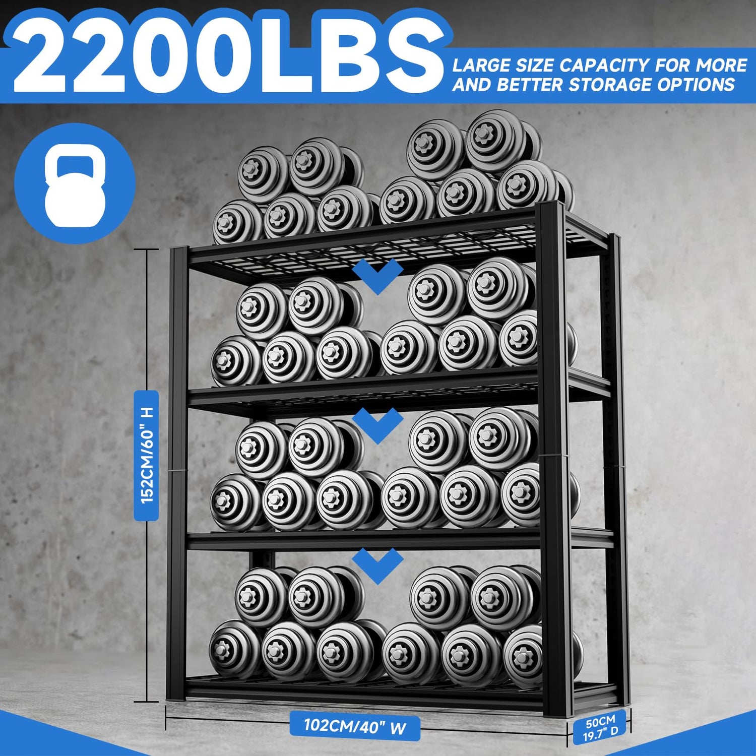 - 2200LBS Sturdy Heavy Duty Metal Garage Shelving: Built with high-quality cold-rolled steel and rust-resistant treatment, this garage shelves can hold up to 2200lbs. Its sturdy frame with double-thickened legs ensures stability, making it perfect for basement storage and garage storage.