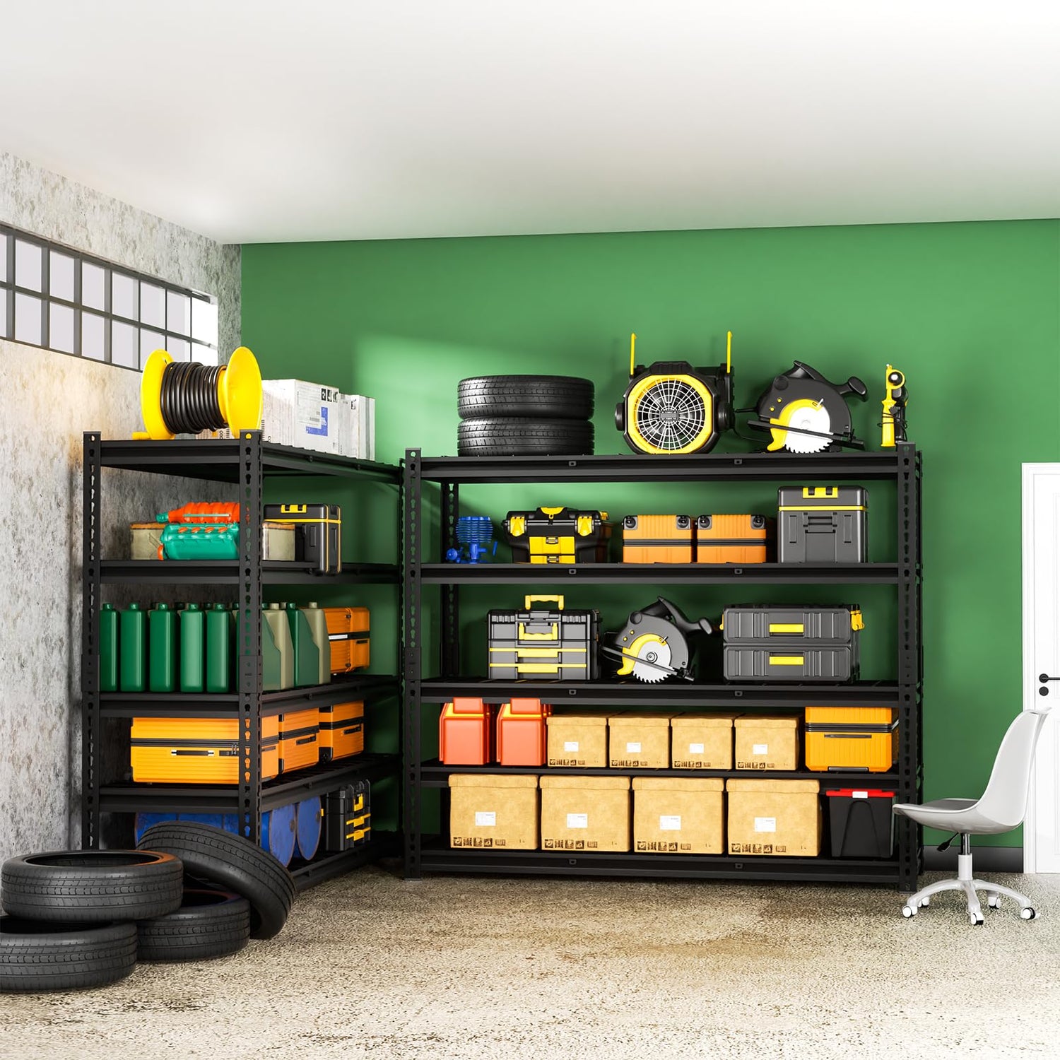 - 5-Tier Heavy Duty Shelving Units: They can safely hold up to 2,500 pounds and are easy to store. The frames are constructed from high-quality cold-rolled steel with metal connectors, ensuring the shelves are structurally sturdy and possess superior load-bearing capacity. Perfect for storage in basements and garages.