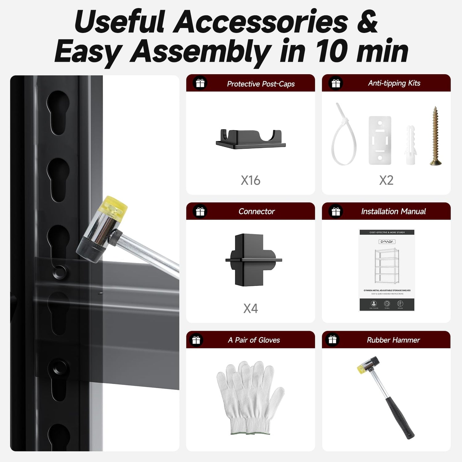- Say Goodbye to Complicated Setups: CYNNDA's user-friendly, heavy-duty storage shelf requires no bolts, screws, or hassle. We provide a rubber mallet, gloves, and a clear, step-by-step manual. Just slide, tap, and you're done! Even beginners can assemble it with ease. Experience hassle-free setup today!