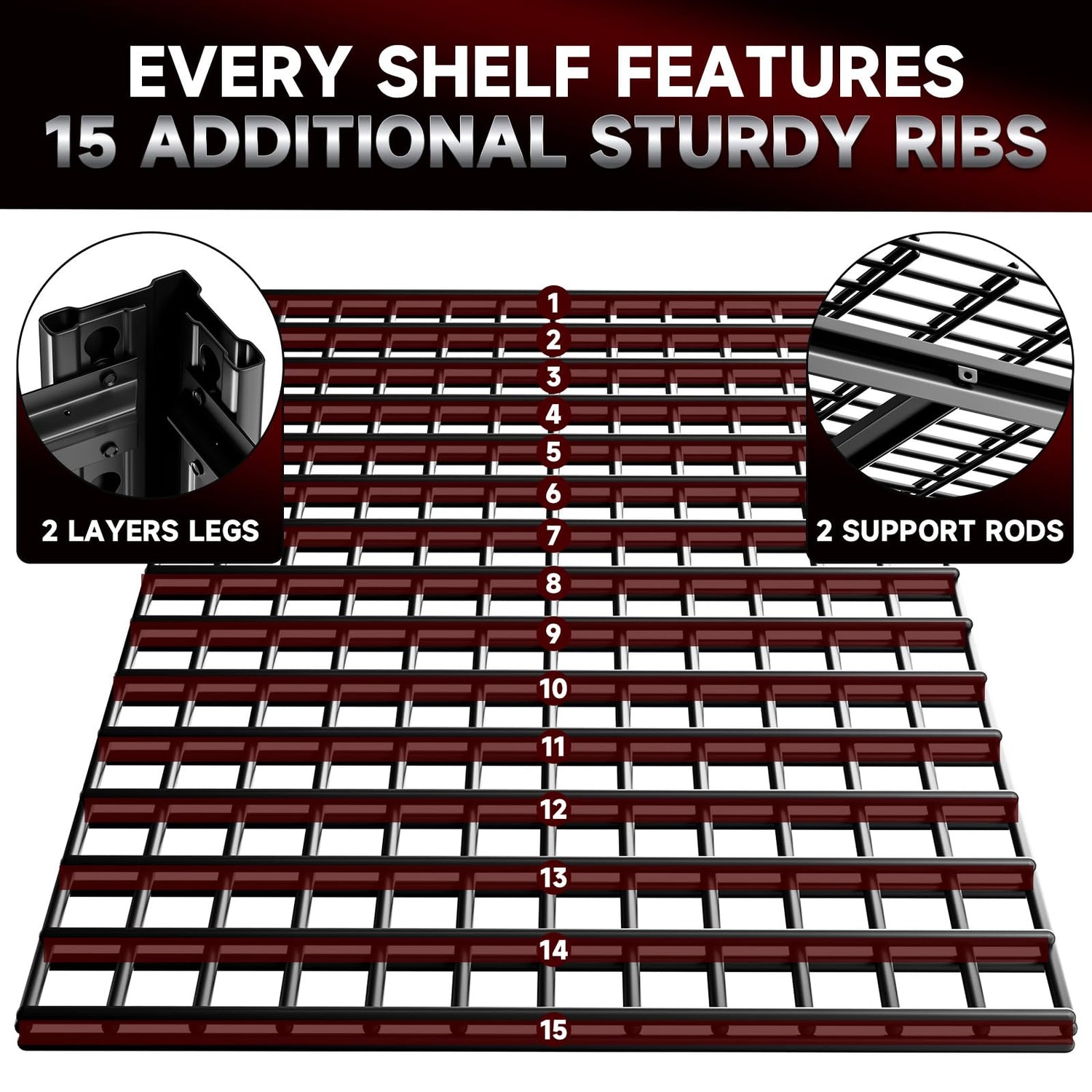 - 3500LBS Heavy Duty Shelving: Our storage rack is crafted from high-strength, premium-quality steel and fortified with thickened double-layered metal pillars, along with 15 extra reinforcing ribs on the backside of each metal wire shelf for added durability.This design provides you with a strong, reliable, and secure storage solution, and the entire storage shelf can support up to 3,500 lbs.