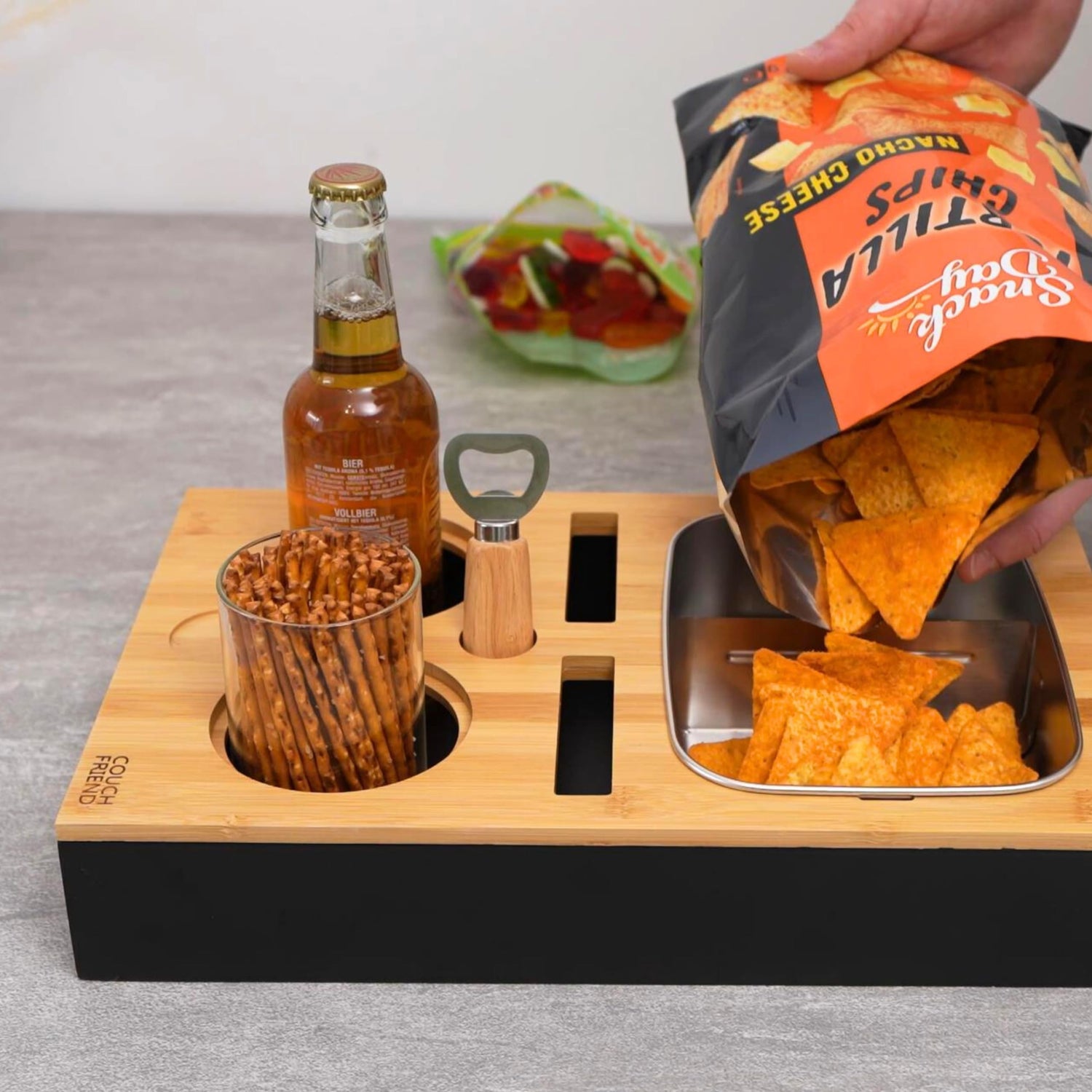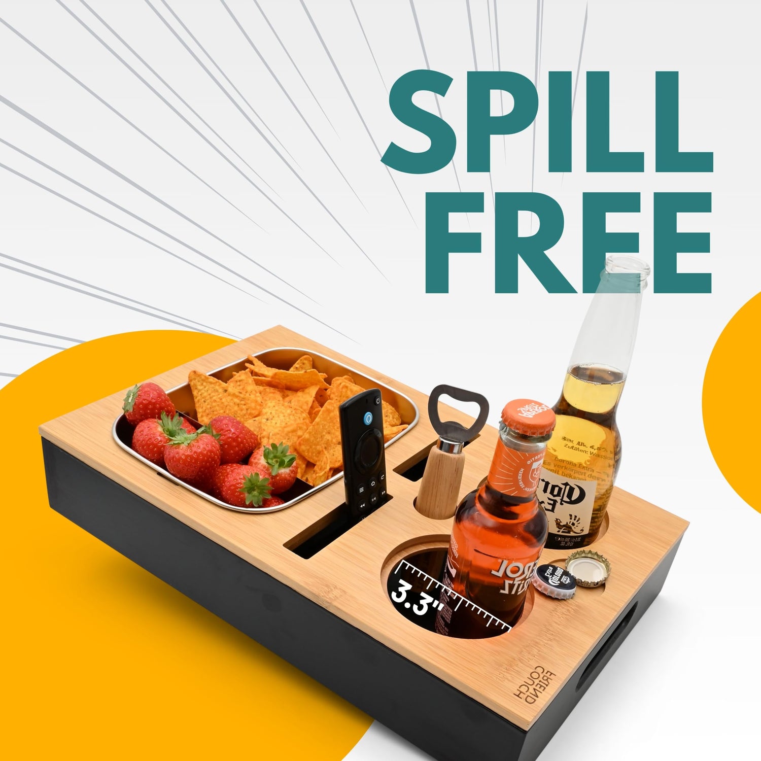 - Versatile Sofa Organizer: Keep drinks, snacks, and remotes within easy reach while relaxing on your sofa. Our couch buddy features dual cup holders designed to accommodate bottles, glasses, and more. The extra-large snack bowl with handy divider makes it the perfect snack dish for cozy evenings.