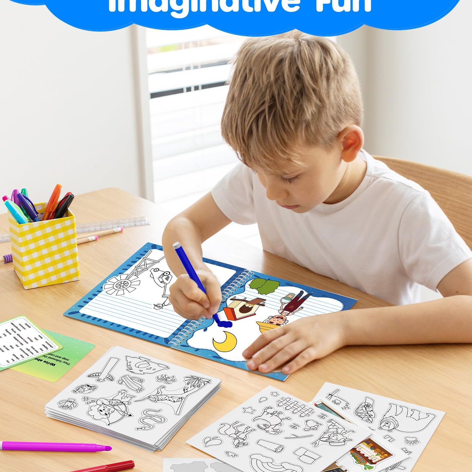 - What's Inside: These arts & crafts supplies include 3 hardbound storybooks, 30 colorful stickers, 10 DIY drawing stickers, 10 writing prompts & vocabulary cards, 12 fruit - scented markers, and 2 pencils