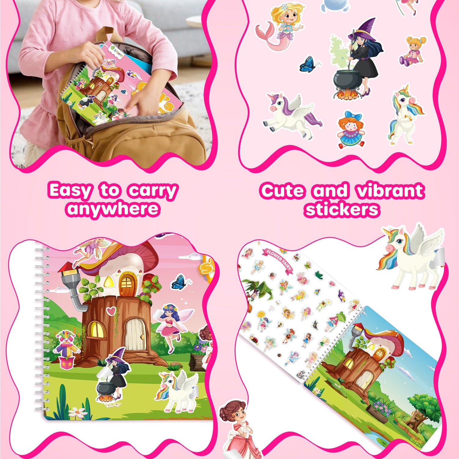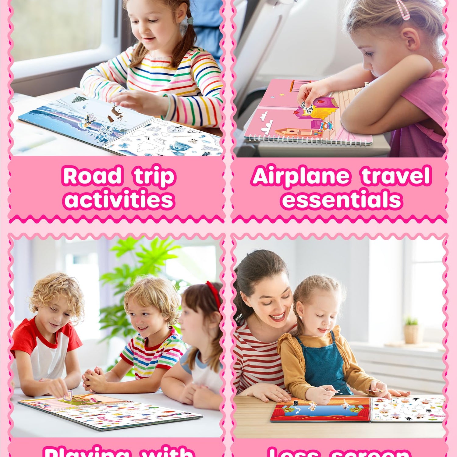 - Travel Essentials for Kids: Keep your child entertained and screen-free during travel with our flat-lay sticker activity book. It’s a must-have for plane and car trips, as well as a great way to keep kids quiet and engaged in restaurants. Whether on family adventures or dining out, children can unleash their creativity and stay focused