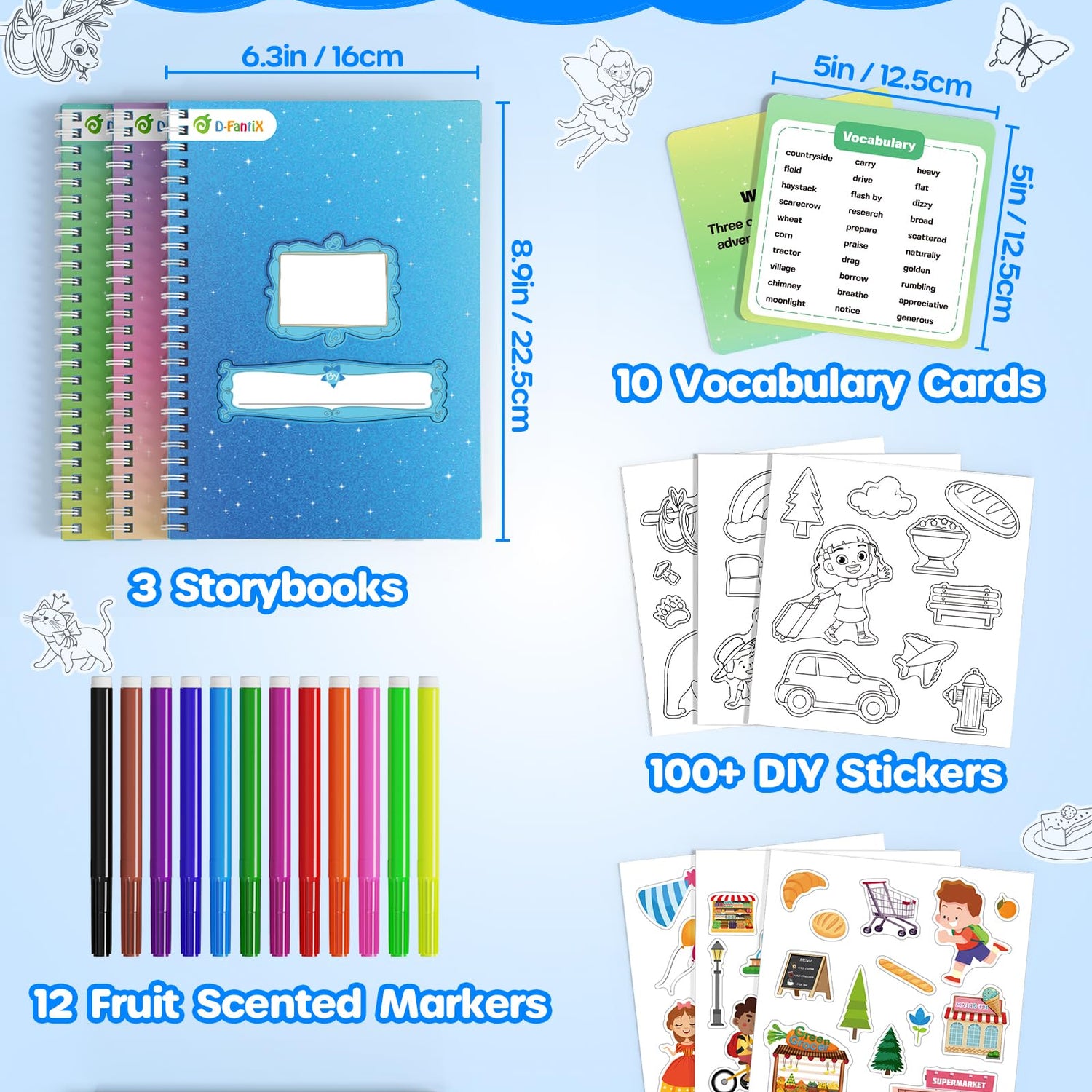 - What's Inside: These arts & crafts supplies include 3 hardbound storybooks, 30 colorful stickers, 10 DIY drawing stickers, 10 writing prompts & vocabulary cards, 12 fruit - scented markers, and 2 pencils