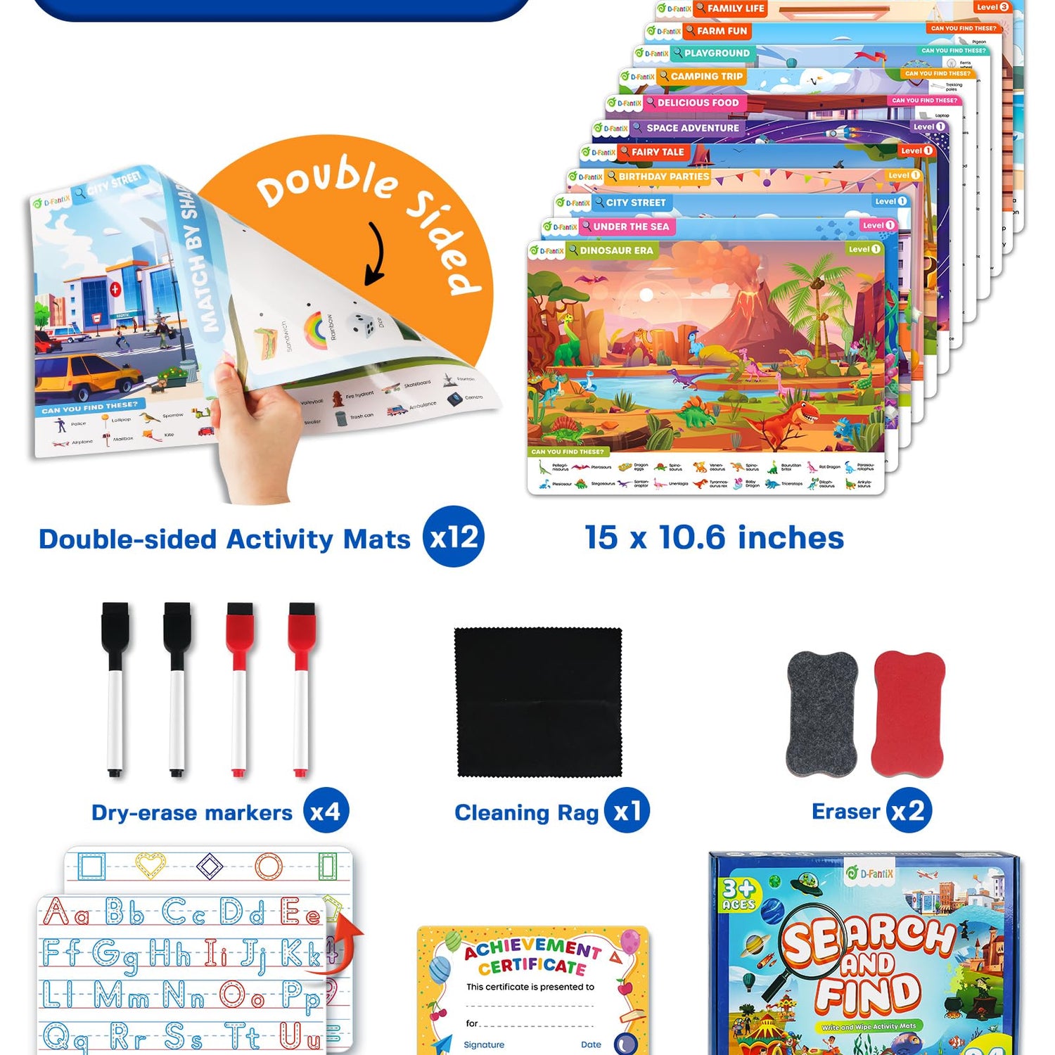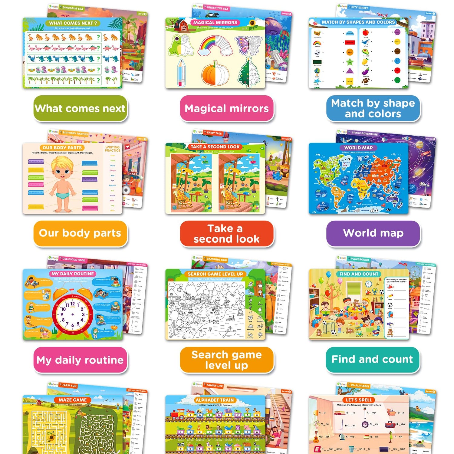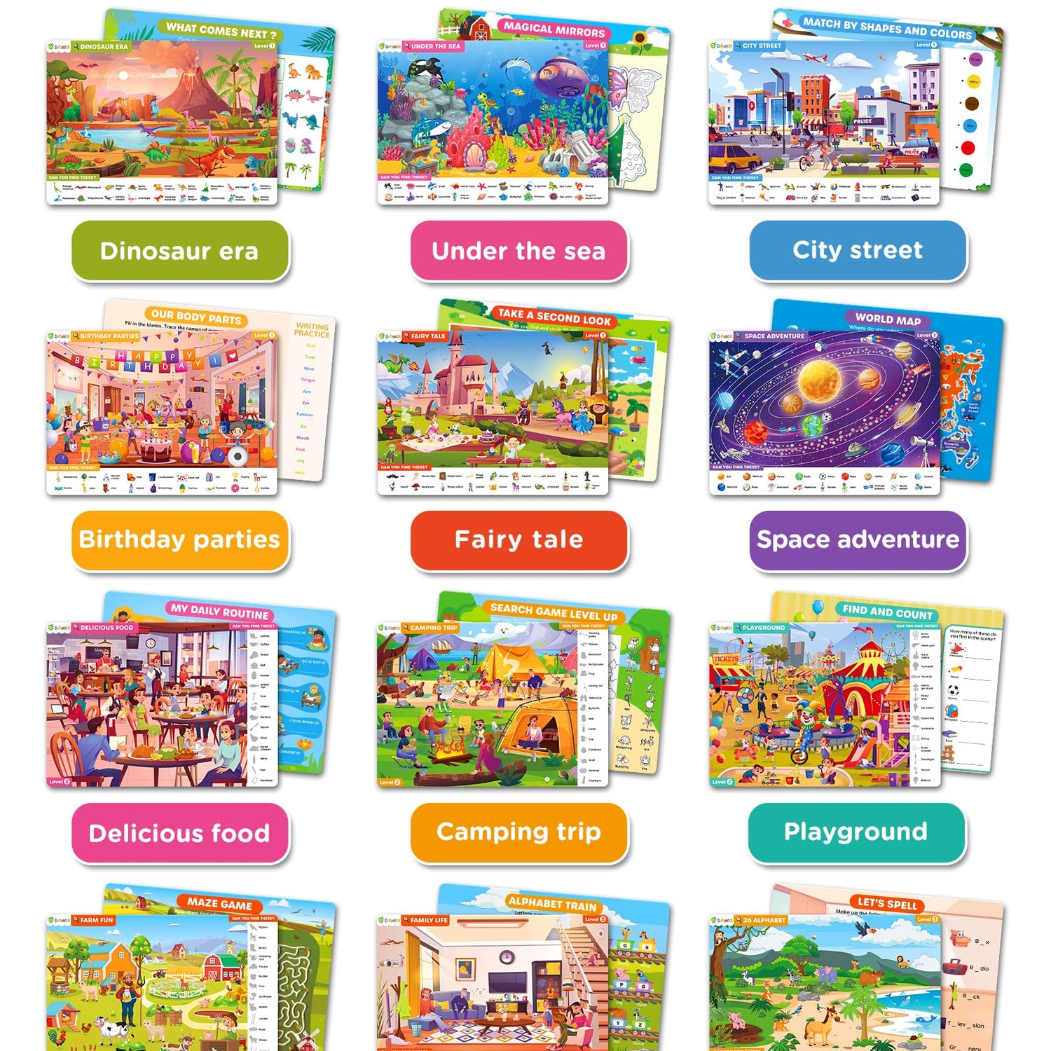 - Search and Find Adventure Book - Engaging Themes and Exciting Activities: Boost your child's skills with our Search and Find card game, featuring 12 double-sided cards and 24 activities. The front side includes 12 scenes divided into three levels: 6 easy, 4 intermediate, and 2 advanced. The back side offers fun activities like maze tracking, counting, shape matching, and spot-the-difference