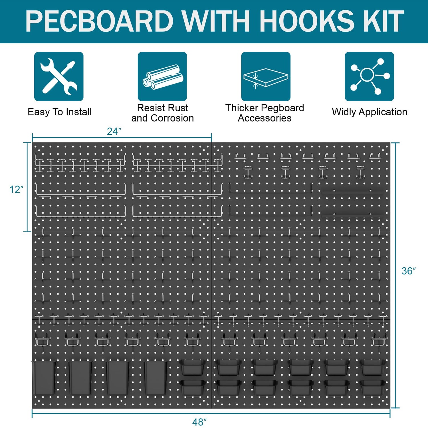 - DURABLE STEEL PEGBOARD:The pegboard wall organizer comes with 6pcs 12"X24" metal pegboard panels,made of high quality metal material, also the all metal construction and black finish provides maximum strength, resist rust and corrosion. Recommend to install pegboard on solid wall, such as wood, brick, conceret wall, Not drywall