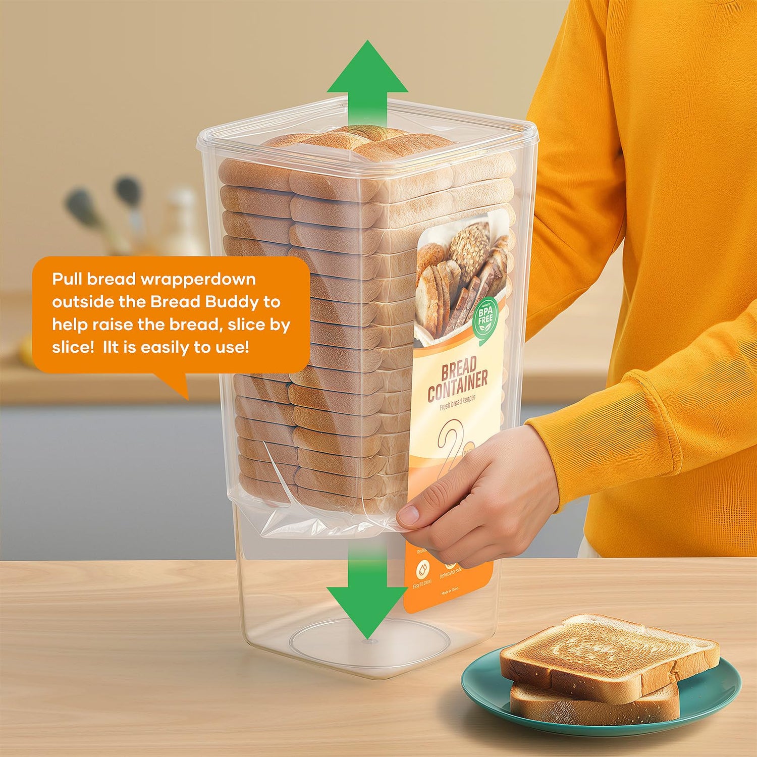 - 【Slice-by-Slice Dispensing with the Plastic Bread Box】Once you place your bag of sandwich bread inside the Bread Buddy plastic bread box, fold any excess bag or wrapper over the edge of the container. Gently pull down on the outer part of the bag to lift the loaf, making it easy to remove one slice at a time. After adjusting the bread to the top of the box, securely replace the lid to help maintain the bread’s freshness for longer