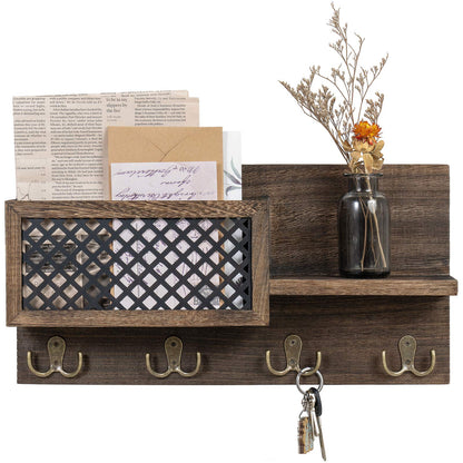 - VERSATILE ORGANIZATION:No more lost keys! This key hanger wall mount with 4 double hooks, you can easily hang your keys on this shelf so you can grab it and walk out the door with ease. This coat rack are also great for hanging your hat, bag, sunglasses, accessories, dog leash and cat collar, finding what you need will no longer be frustrating. 1 slot to storage mails,letters,newspaper,bills or more; 1 small floating shelf to display small succulent,sunglasses, accessories ornament or more.