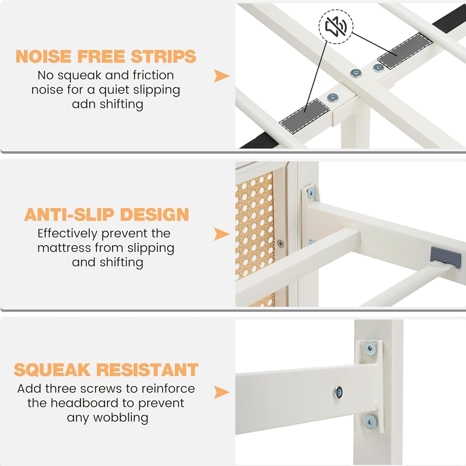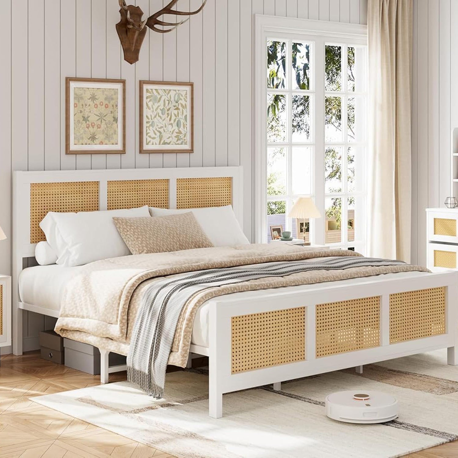 dainslef Rattan Bed Frame with Headboard, Queen Bed Frame with Strong Metal Slats Support, Noise-Free Design, No Box Spring Needed, White