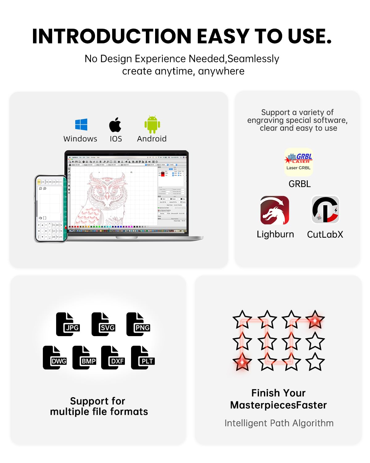 - 【Multiple Systems】Customers can choose the appropriate software to manipulate A6 to complete your engraving ideas according to your own habits. Not only can be operated by Cell phone, but also can operated by laptops.
