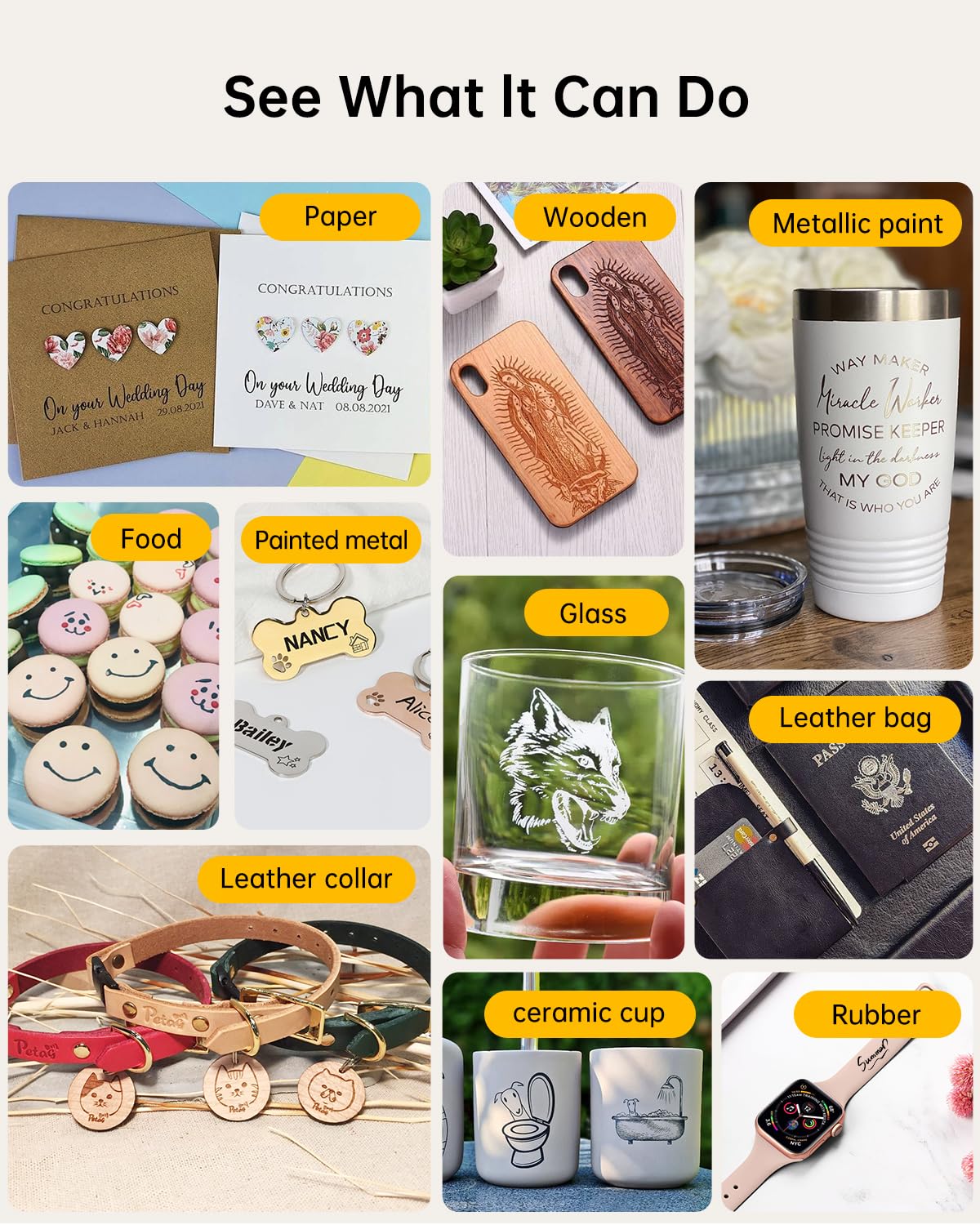 - [Engraving on Various Material] The laser engraving machine can sculpture your desired picture&logo on various materials. It is able to engrave on papers, Kraft papers, woods, ceramics, leathers, bamboos, painted metal, etc.