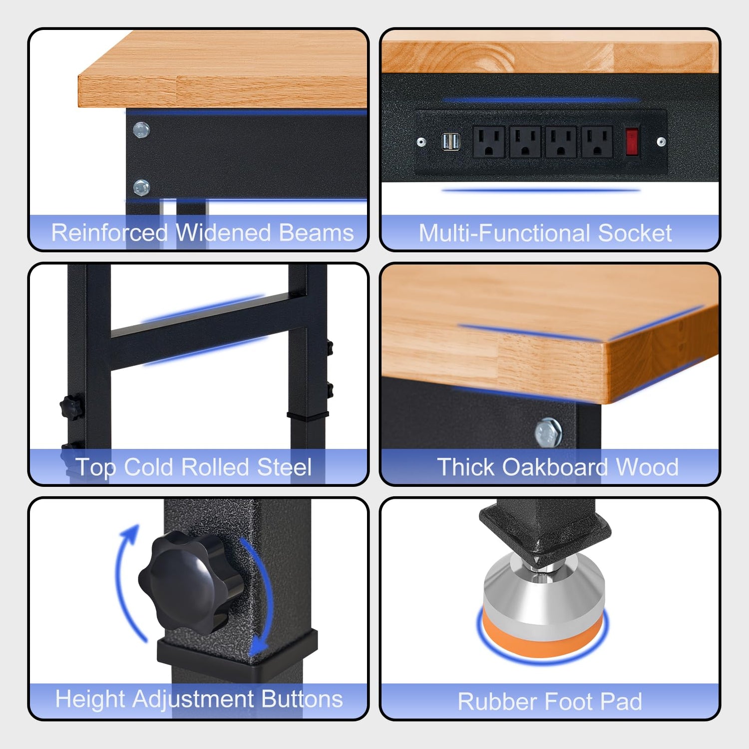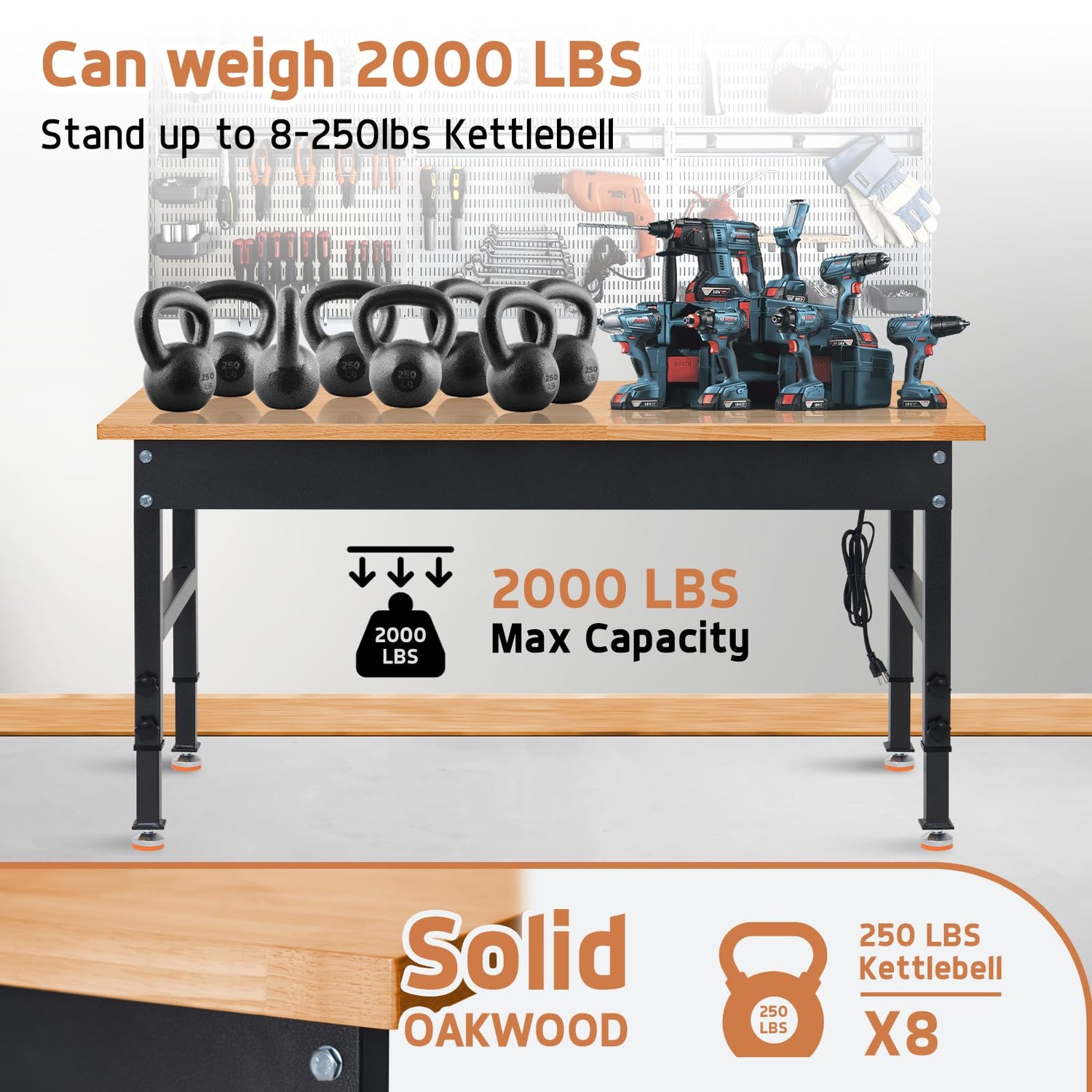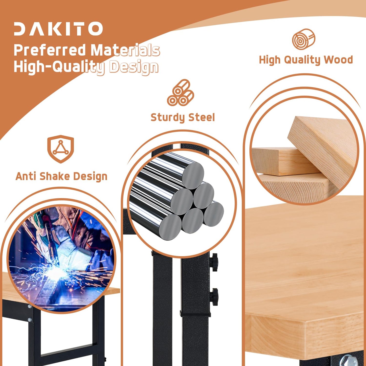 DAKITO 48" Heavy-Duty Workbench Adjustable Work Bench Work Table 2000 LB Load Capacity w/Hardwood Top, Power Outlets, Foot Pads and Metal Frame for Garage, Workshop, Office, Home, Workstation
