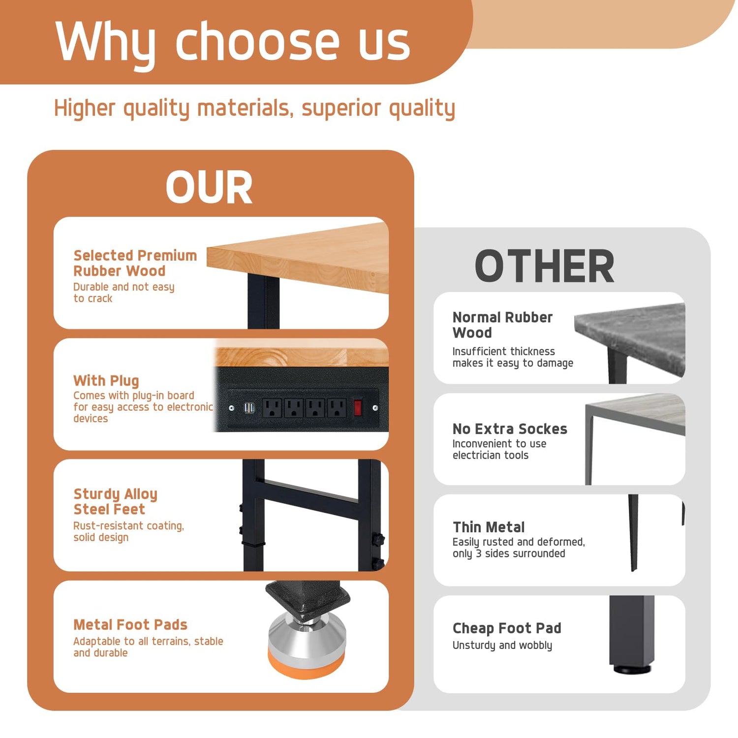 - [Durable Materials&Construction for Longevity] FSC-certified thicken rubber wood tabletops, coated with Safe and odorless finishes, offer a smooth surface that can withstand heavy loads and frequent use without succumbing to wear and tear.Complementing the premium tabletops are quality robust steel frames, featuring precision-cut components and durable coatings, which provide exceptional strength and stability. Thick crossbars and reinforced legs further enhance the structural integrity of these workbenches, ensuring they remain steadfast under demanding conditions, making them resistant to cracking, warping, or corrosion over time