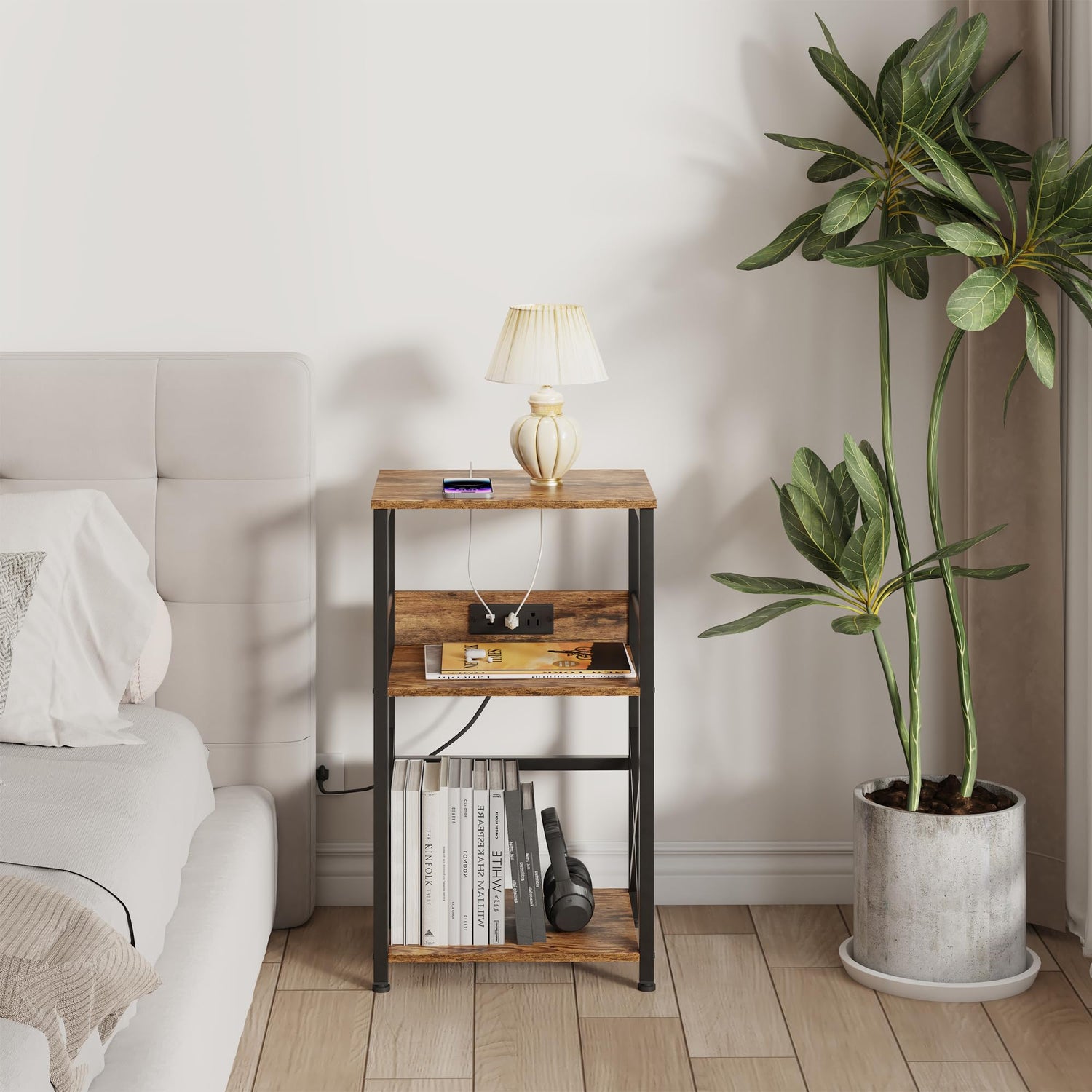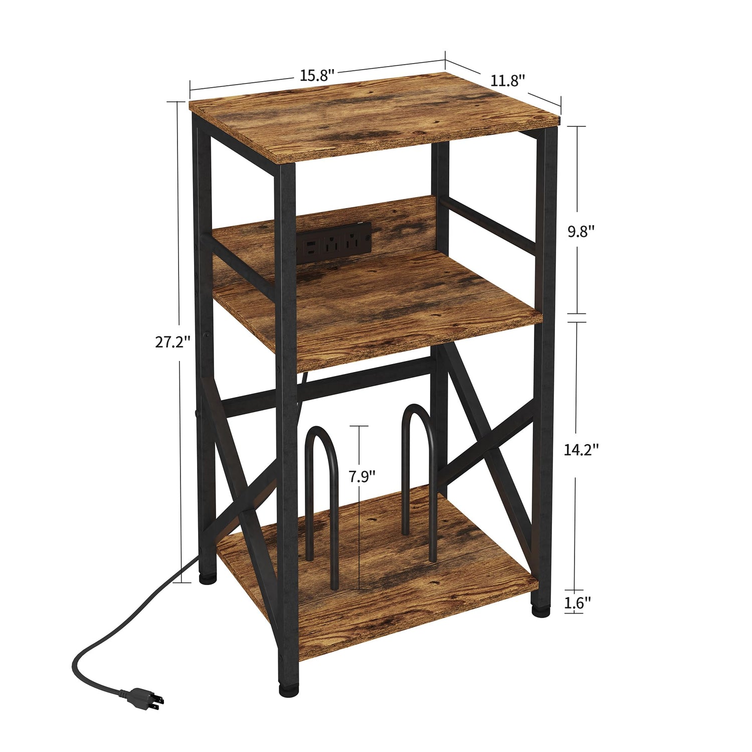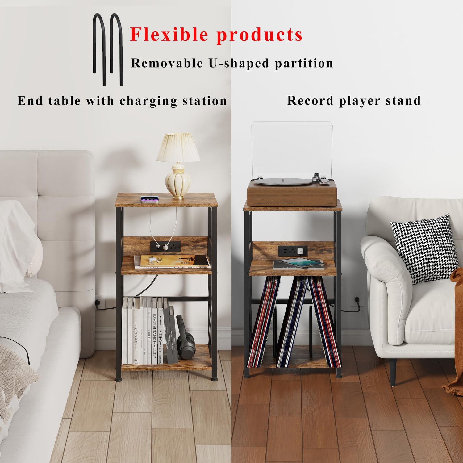 DALEMHOME Record Player Stand with Charging Station, Turntable Stand with Storage, Record Table for Vinyl, 3 Tier End Table for Living Room, Bedroom, Rustic Brown HKET1001BR